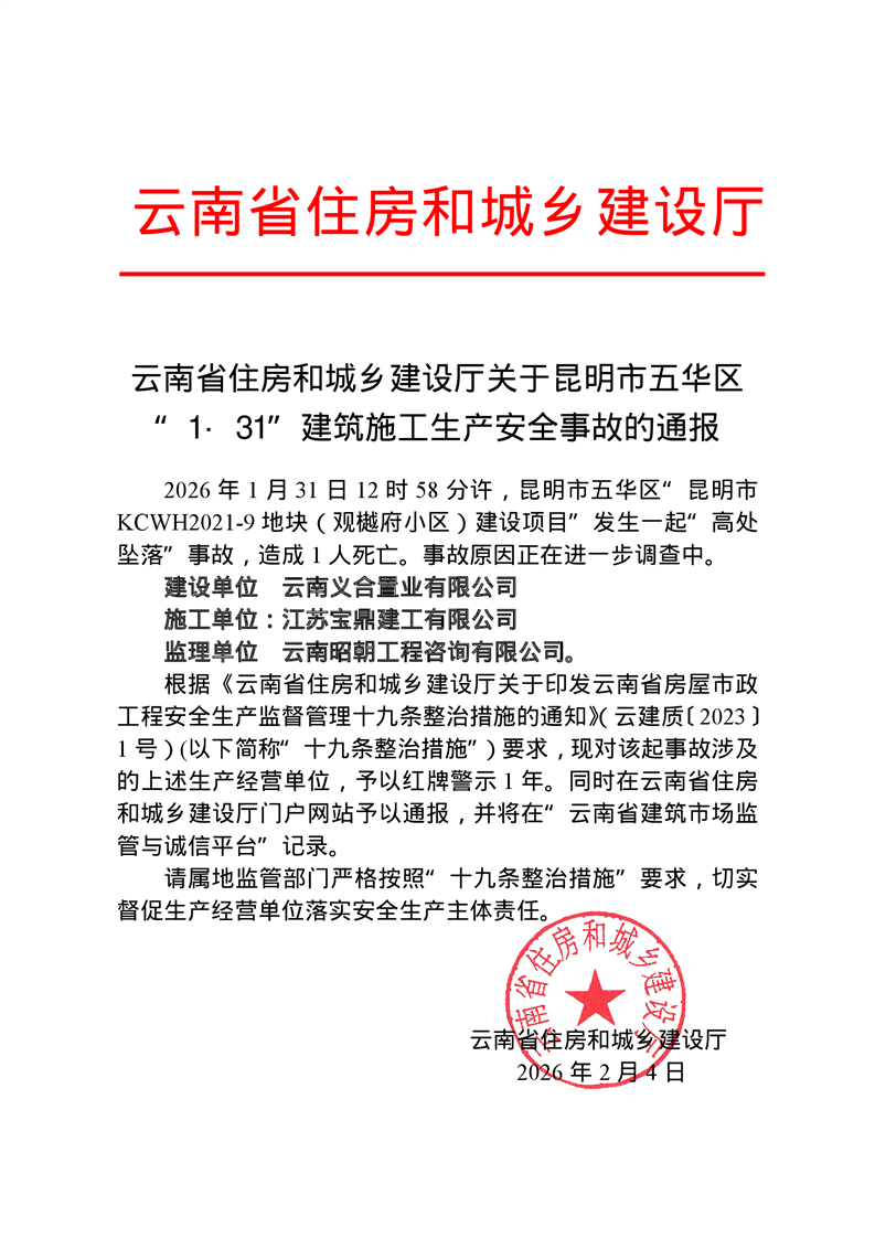 云南省住房和城乡建设厅关于昆明市五华区“1·31”建筑施工生产安全事故的通报