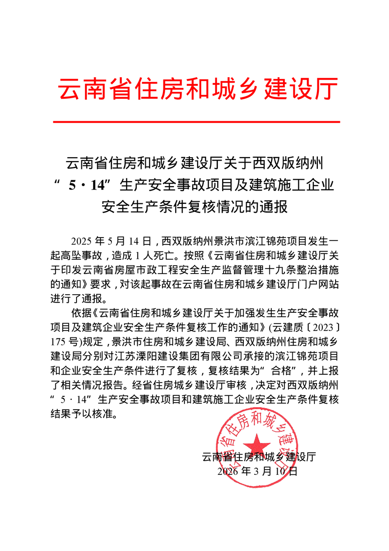 云南省住房和城乡建设厅关于西双版纳州“5·14”生产安全事故项目及建筑施工企业安全生产条件复核情况的通报