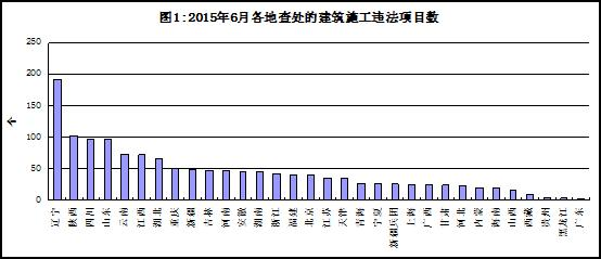 从各地查处的违法工程项目数量看,辽宁、陕西、四川、山东、云南、江西6省查处力度较大,分别查处项目192个、103个、98个、97个、73个、72个(见图1)。