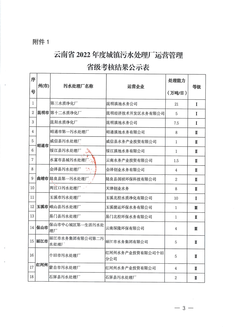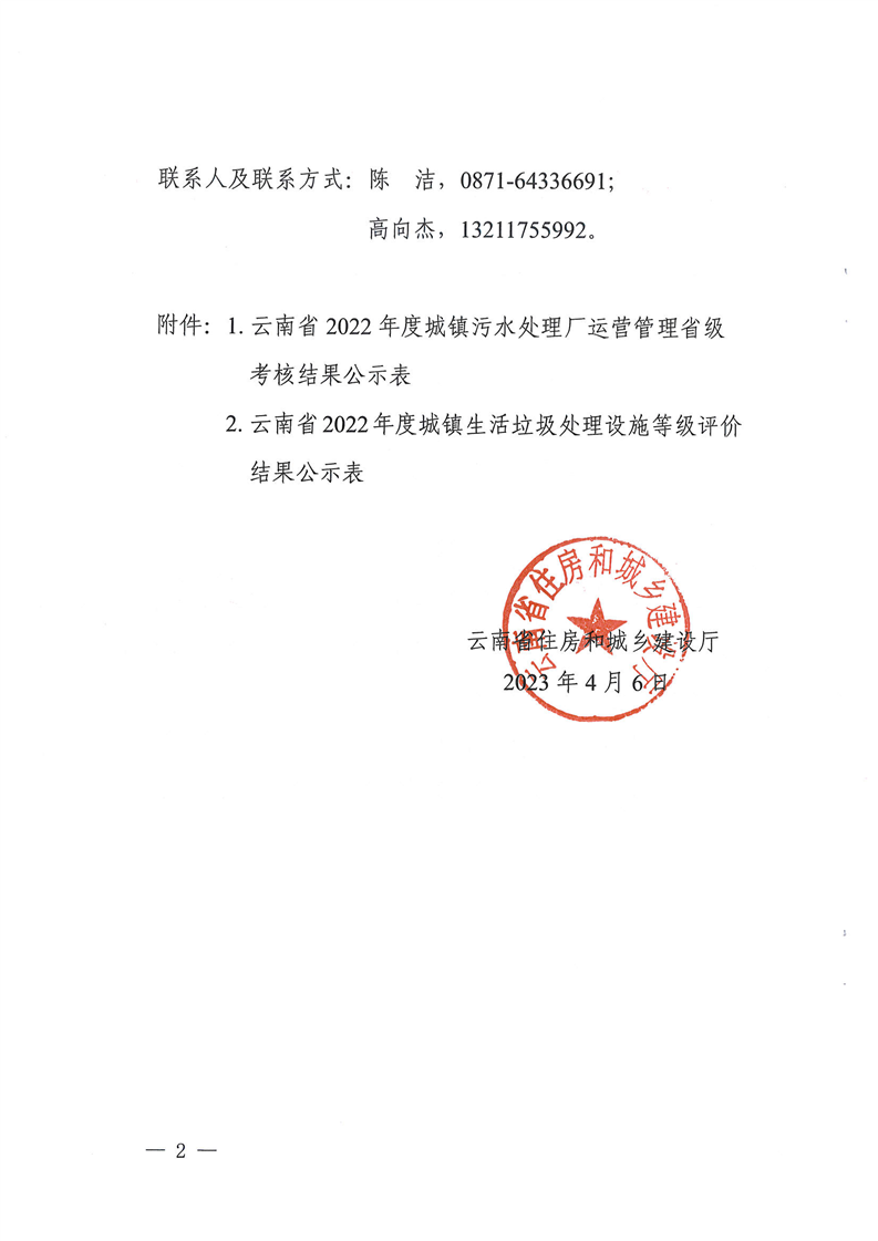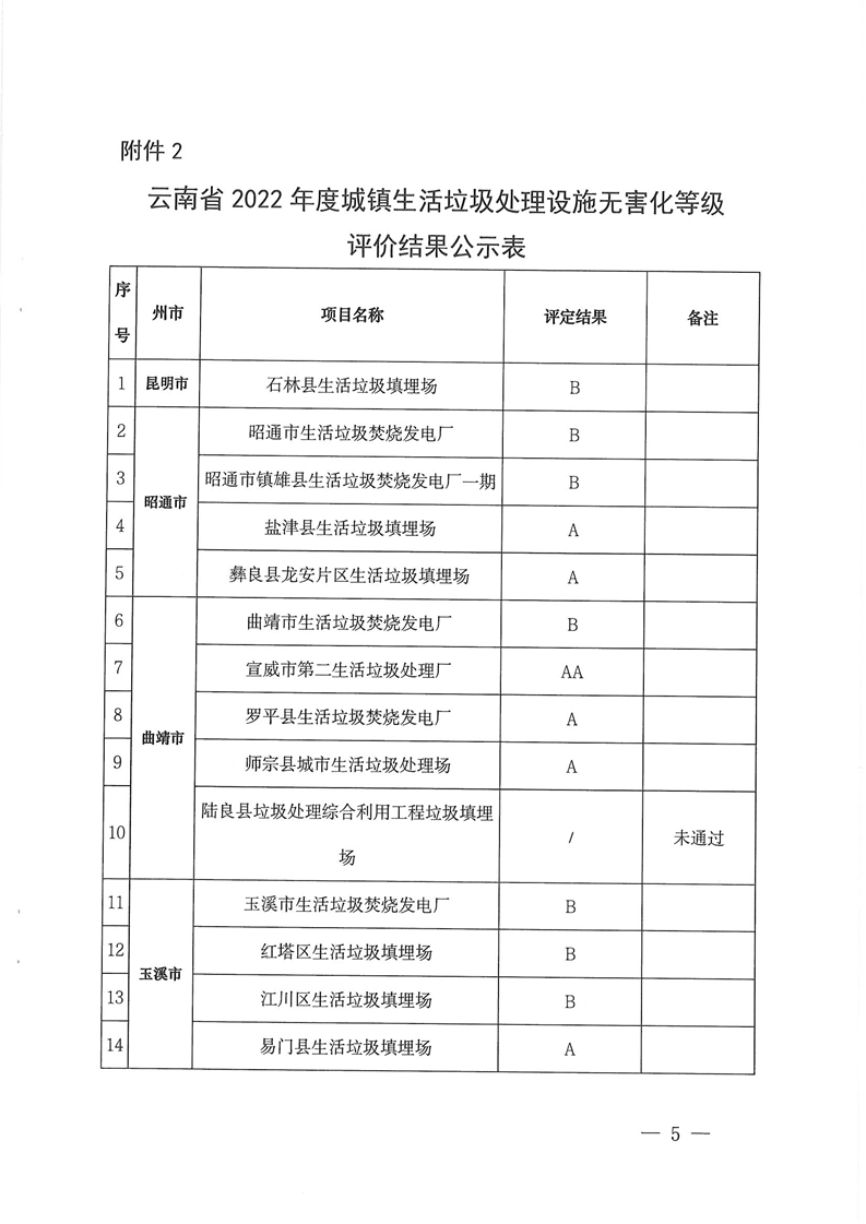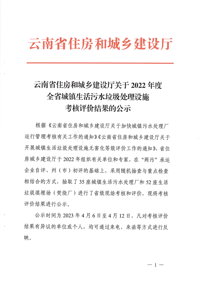 云南省住房和城乡建设厅关于2022年度全省城镇生活污水垃圾处理设施考核评价结果的公示