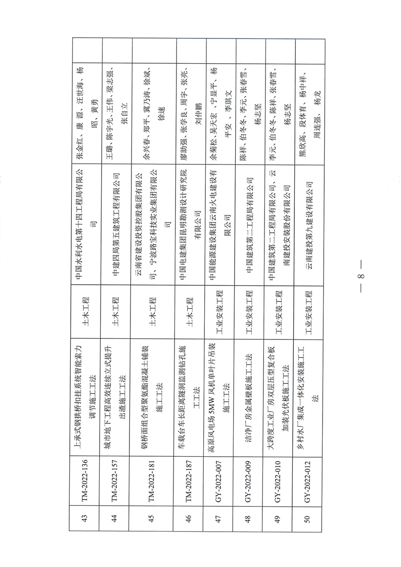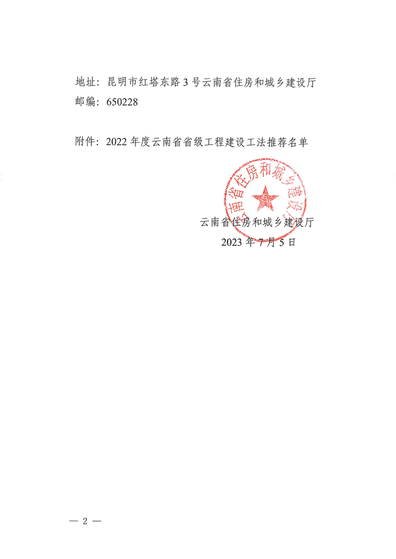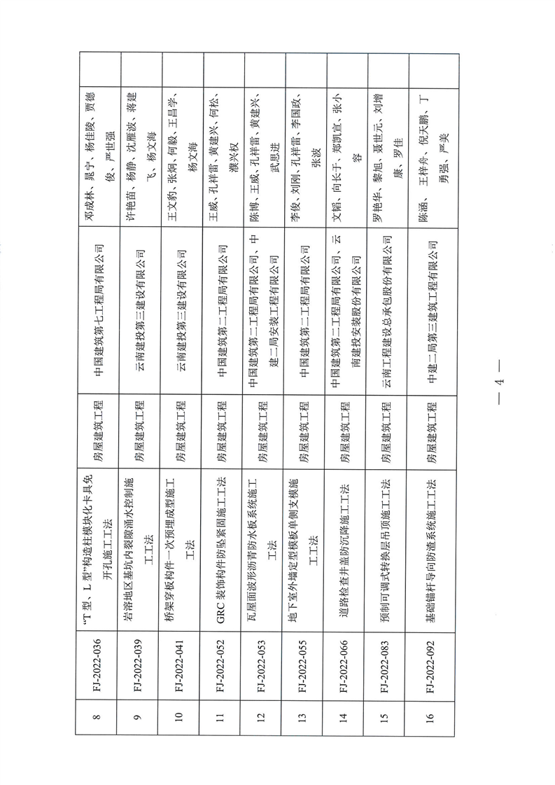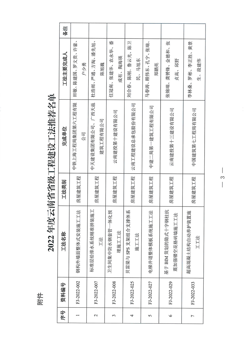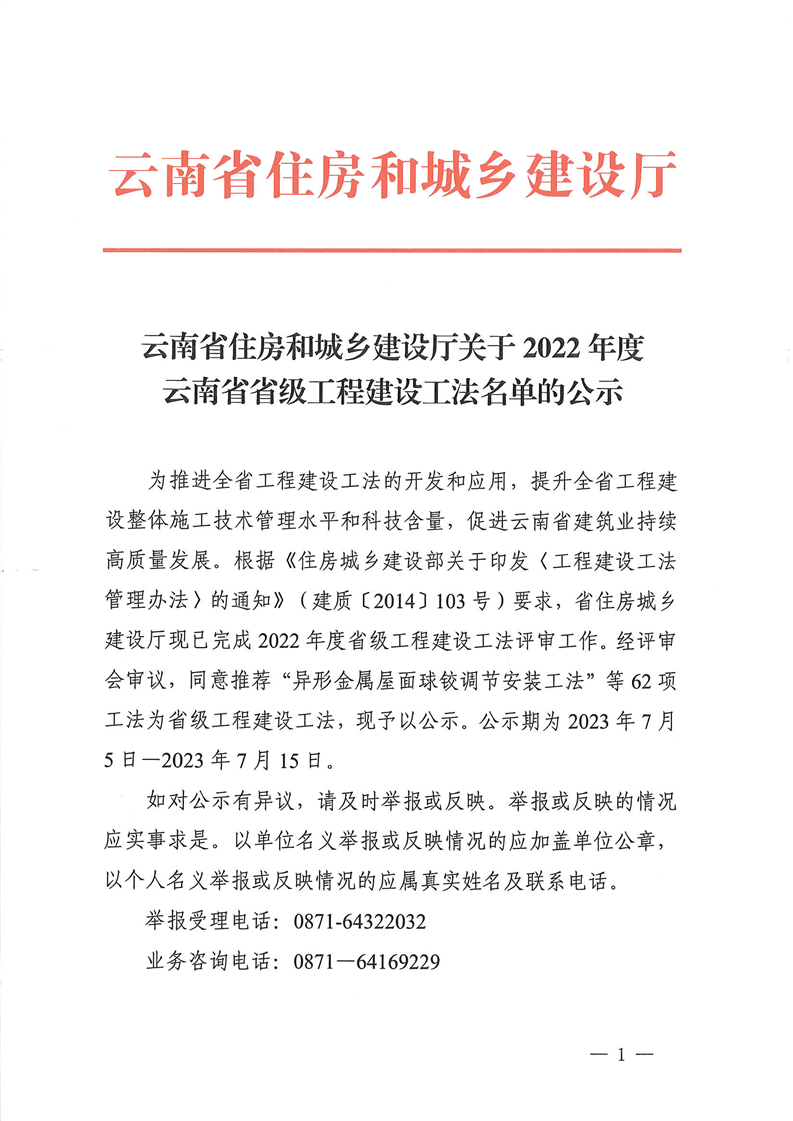云南省住房和城乡建设厅关于2022年度云南省省级工程建设工法名单的公示