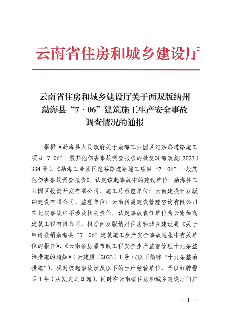 云南省住房和城乡建设厅关于西双版纳州勐海县“7.06”建筑施工生产安全事故的通报