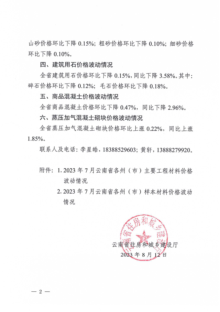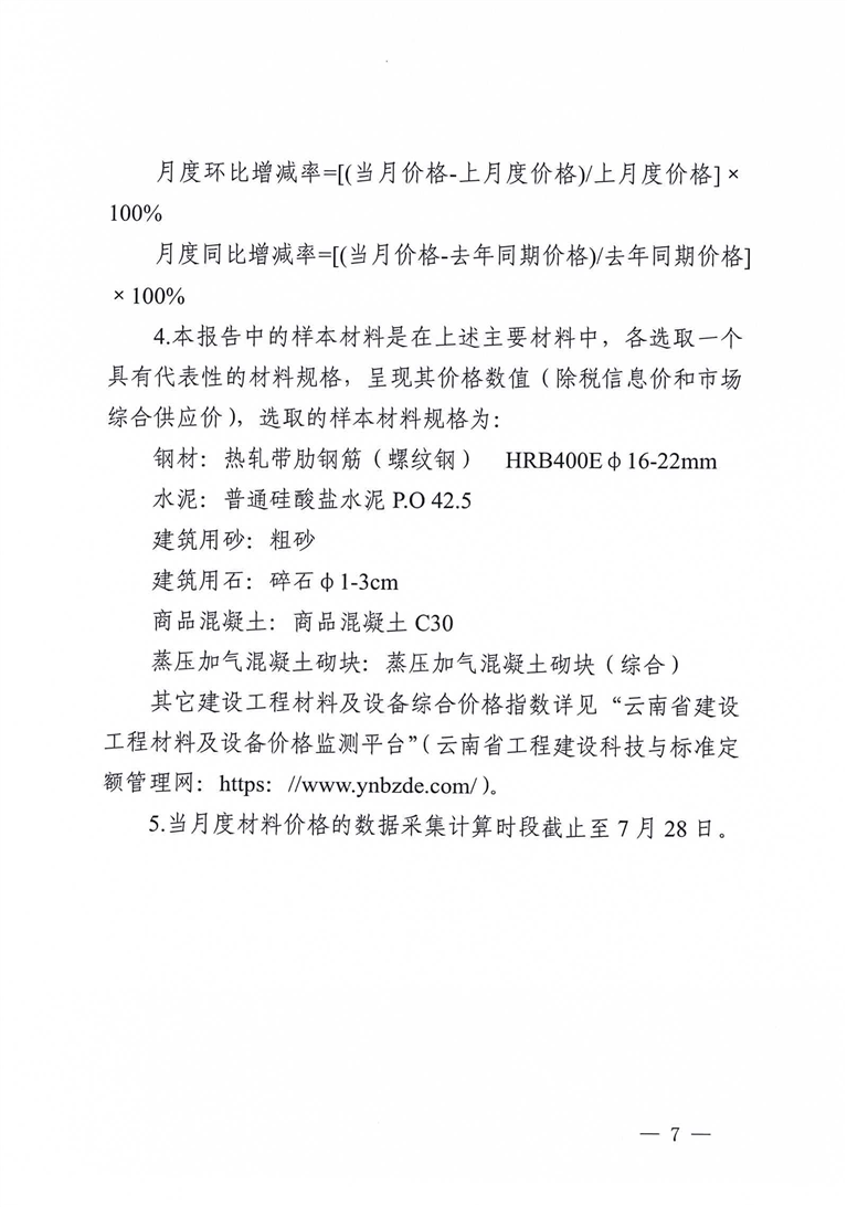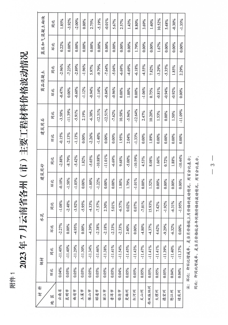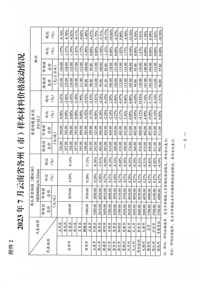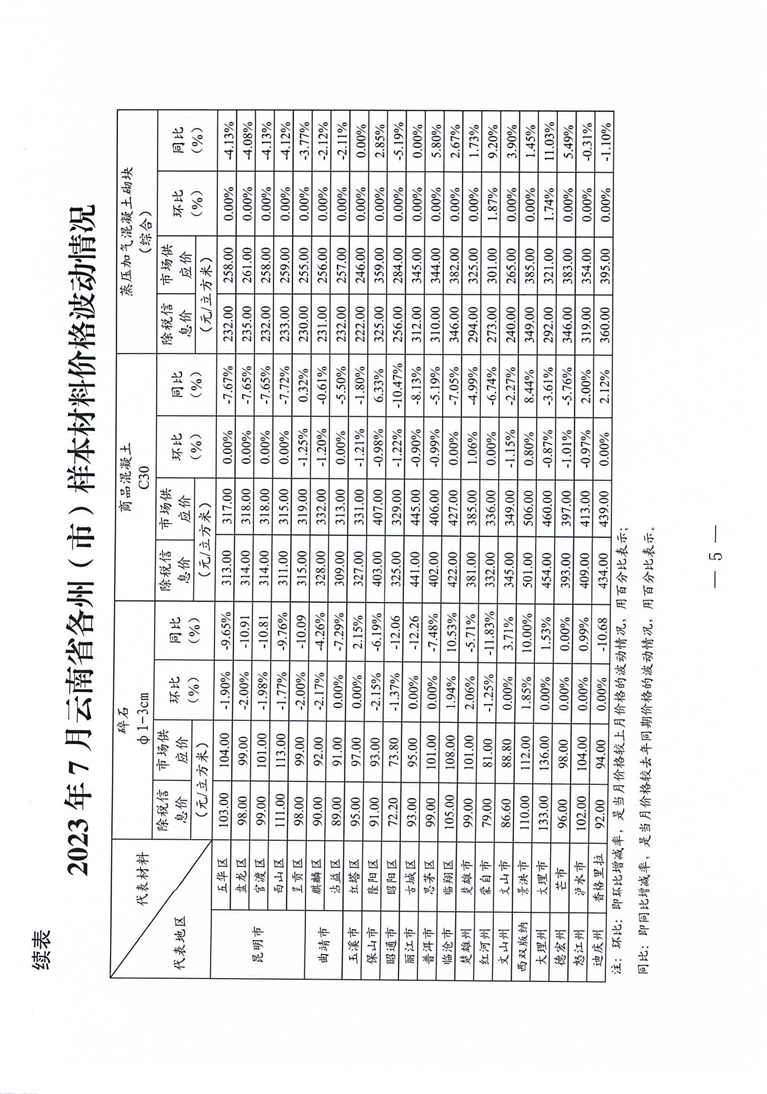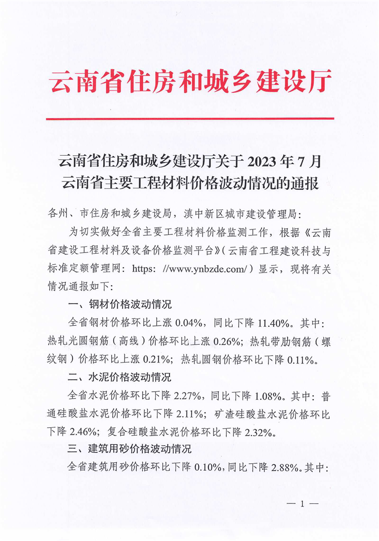 云南省住房和城乡建设厅关于2023年7月云南省主要工程材料价格波动情况的通报