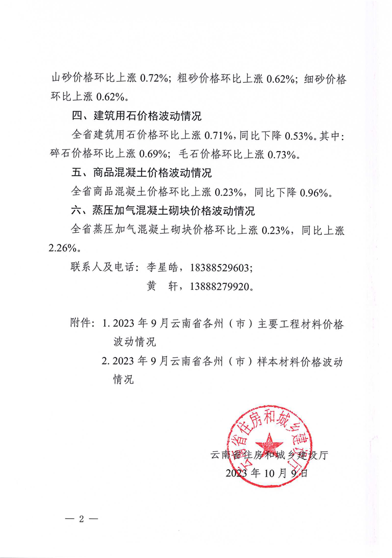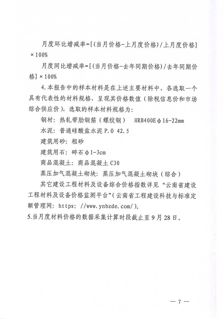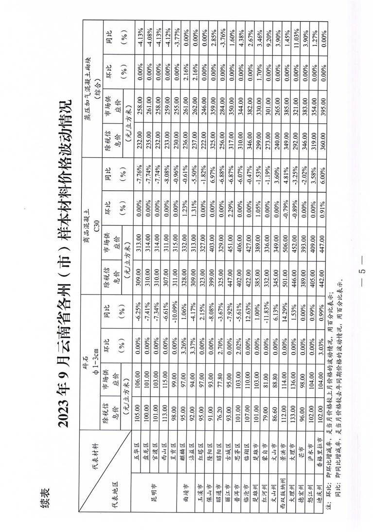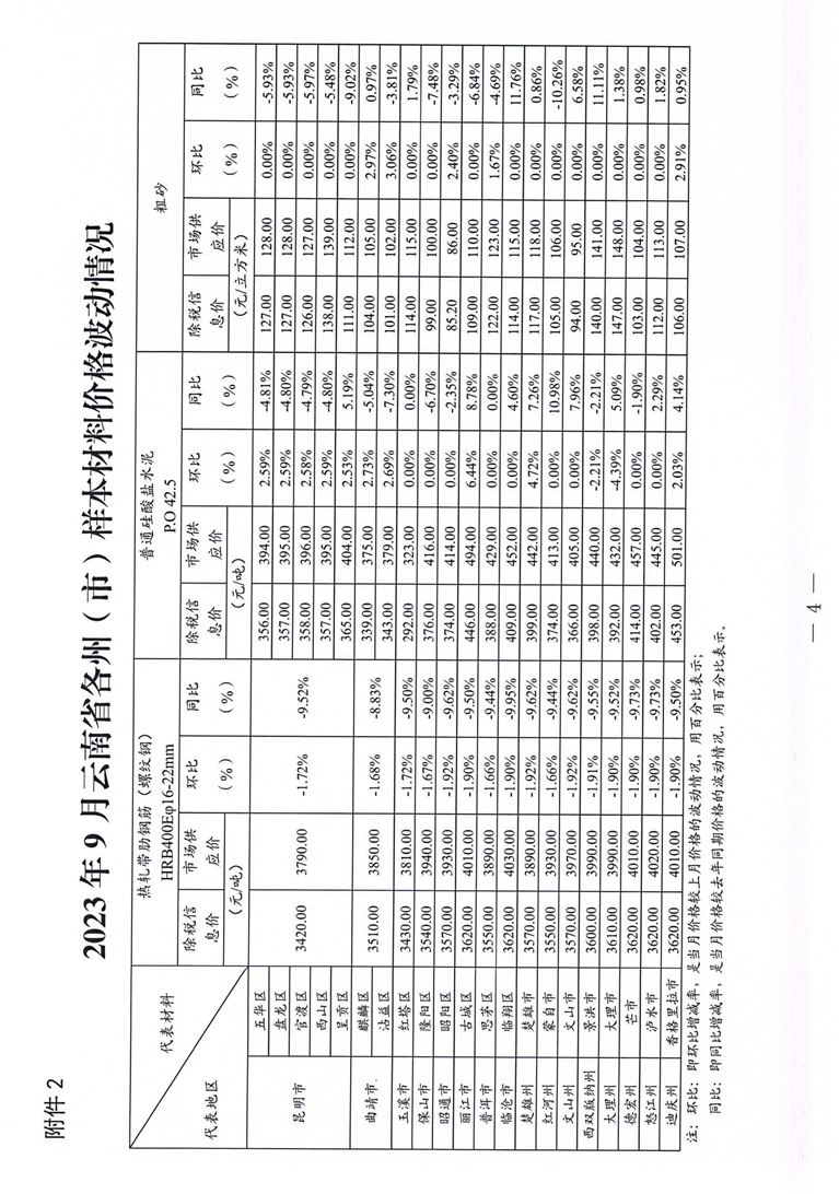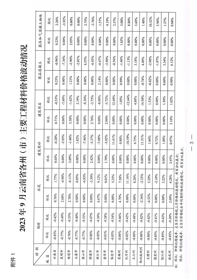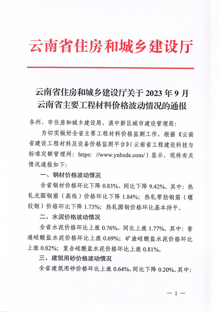 云南省住房和城乡建设厅关于2023年9月云南省主要工程材料价格波动情况的通报