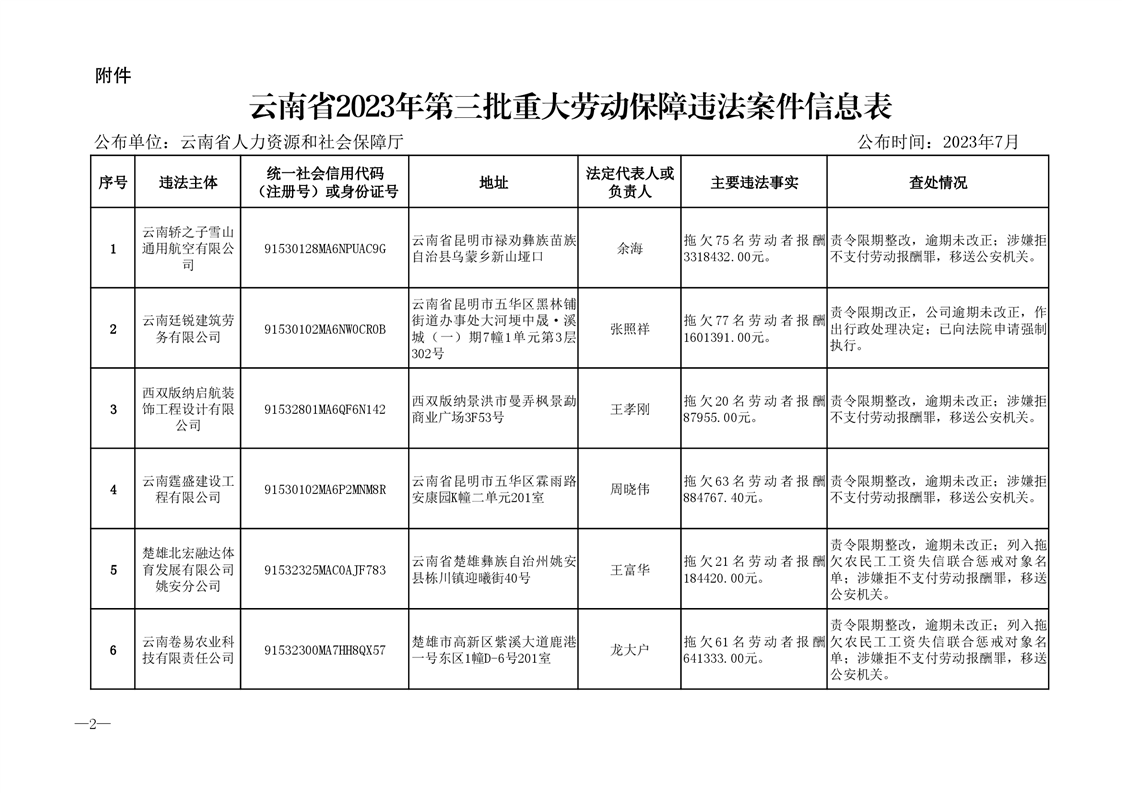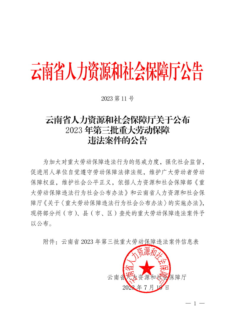 云南省人力资源和社会保障厅关于公布2023年第三批重大劳动保障违法案件的公告