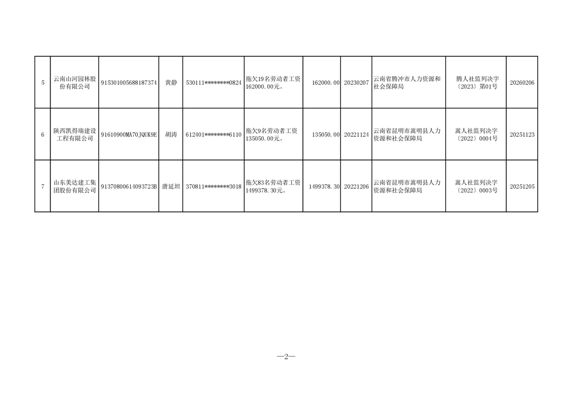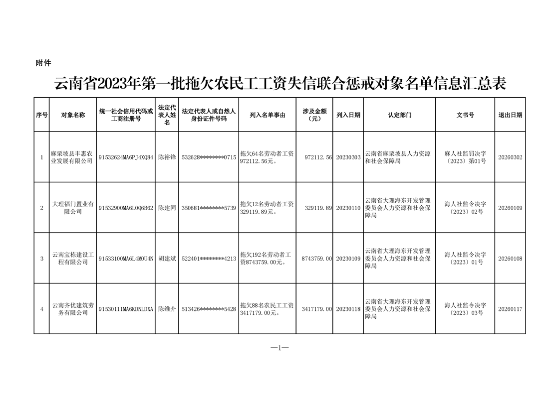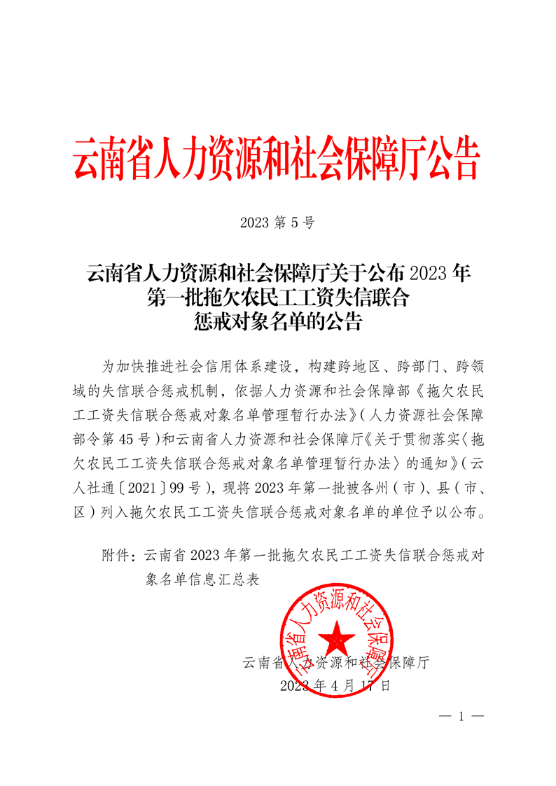 云南省人力资源和社会保障厅关于公布2023年第一批拖欠农民工工资失信联合惩戒对象名单的公告