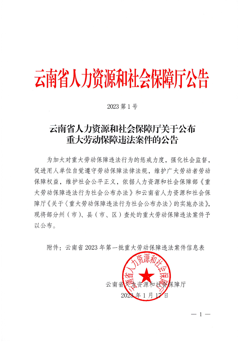 云南省人力资源和社会保障厅关于公布重大劳动保障违法案件的公告
