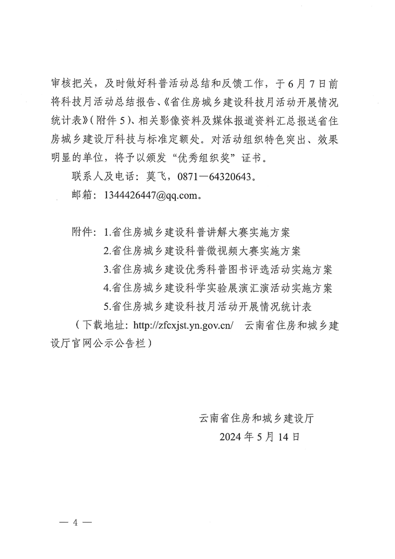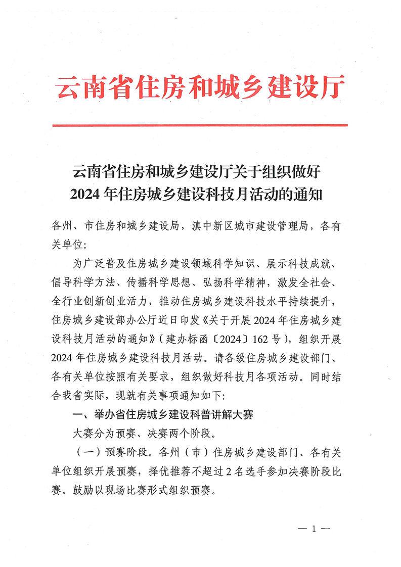 云南省住房和城乡建设厅关于组织做好2024年住房城乡建设科技月活动的通知