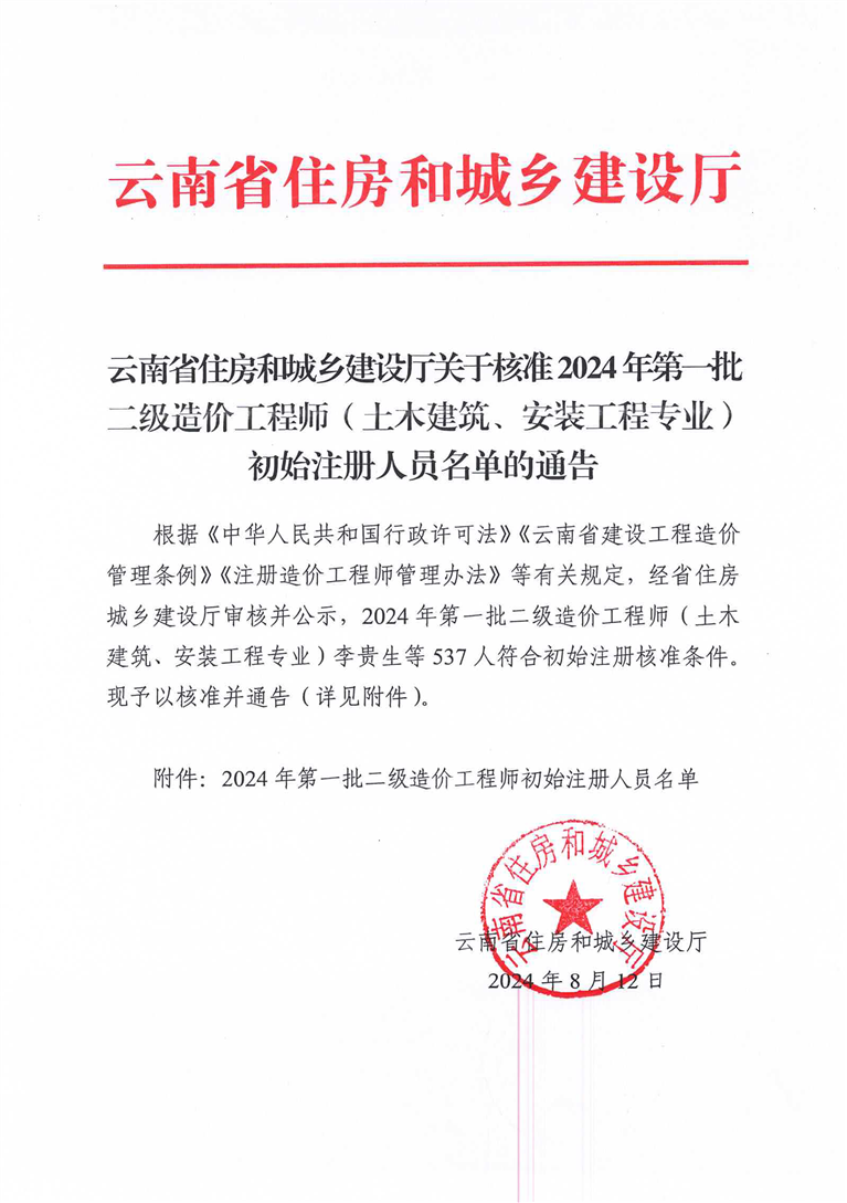 云南省住房和城乡建设厅关于核准2024年第一批二级造价工程师(土木建筑、安装工程专业)初始注册人员名单的通告