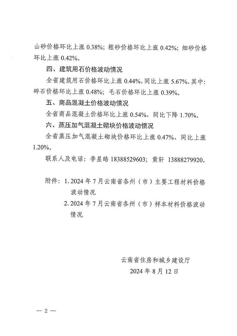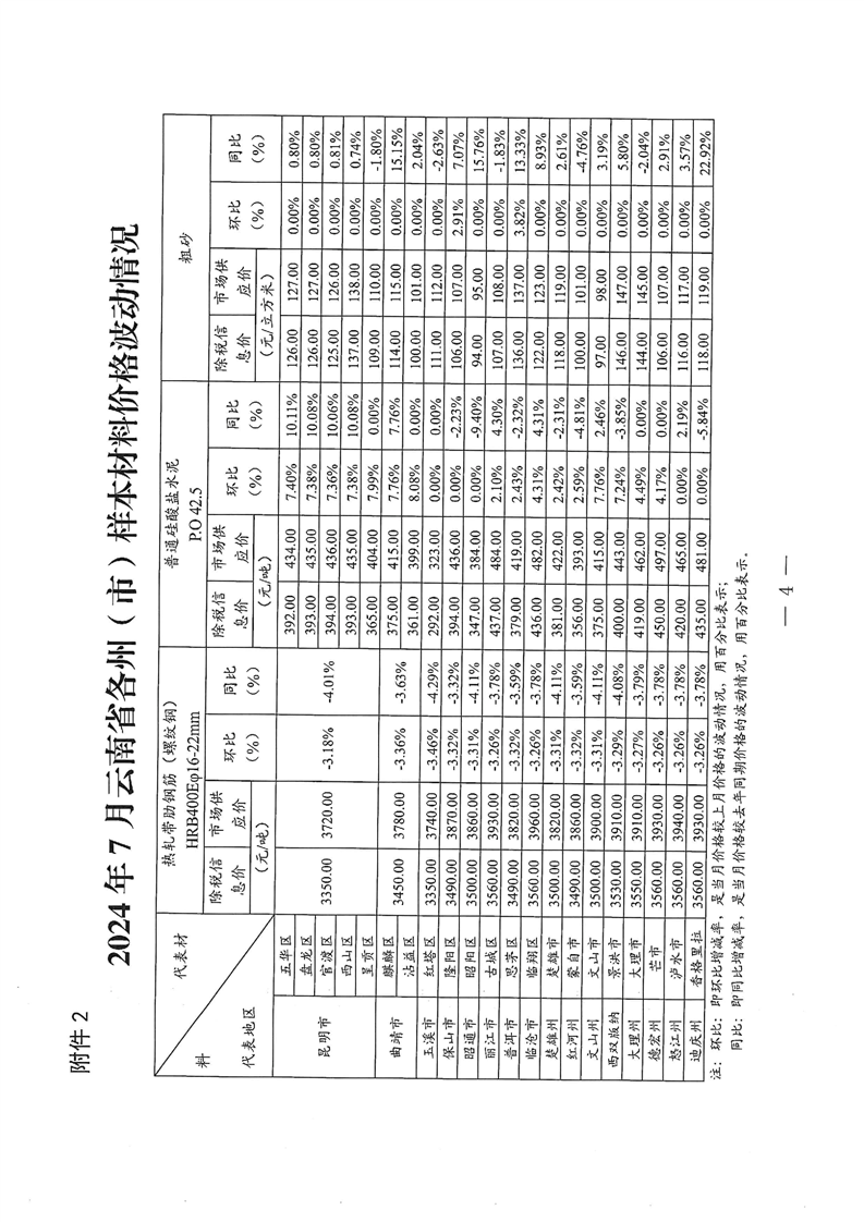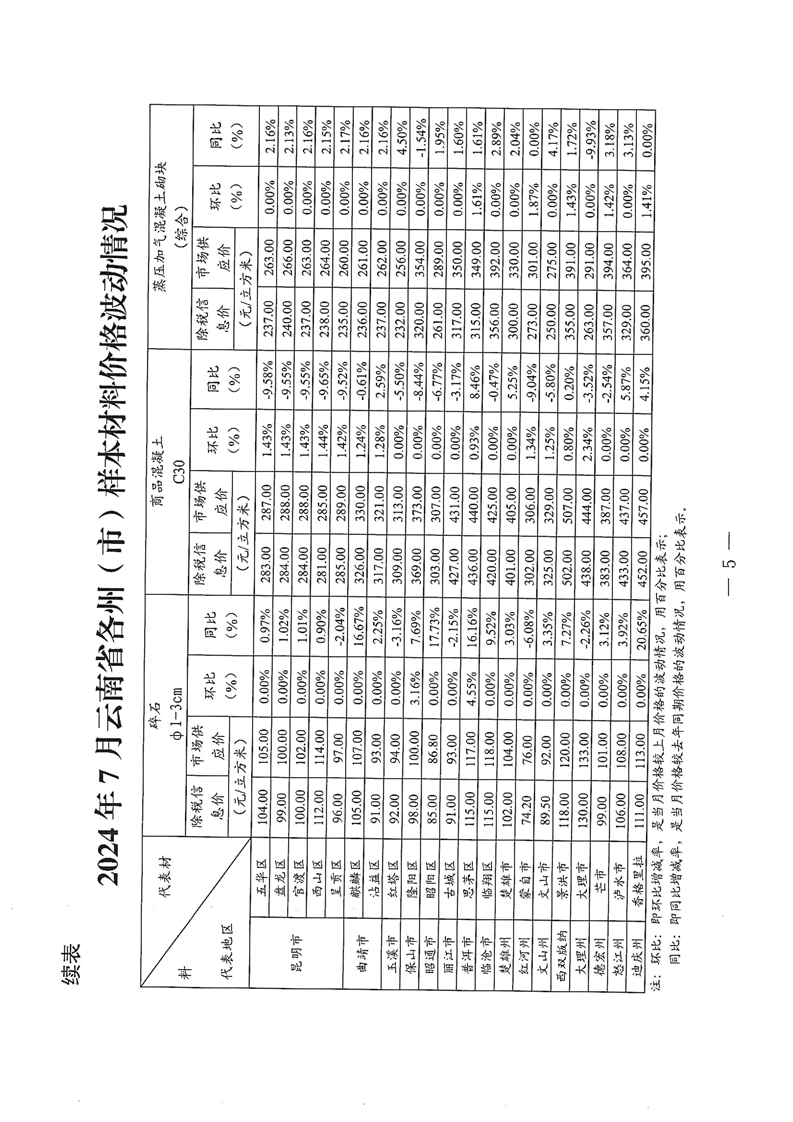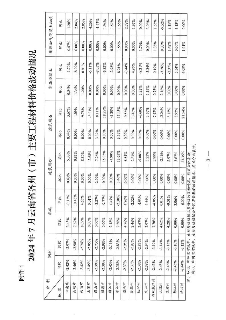 云南省住房和城乡建设厅关于2024年7月云南省主要工程材料价格波动情况的通报
