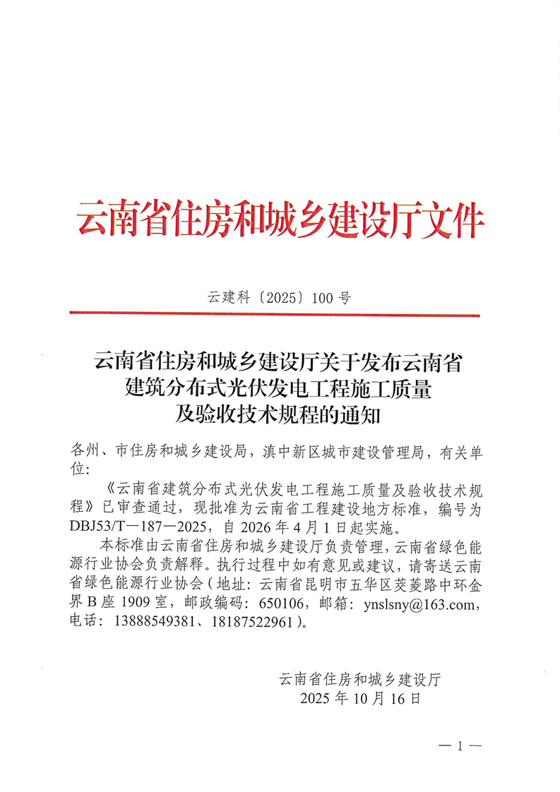 云南省住房和城乡建设厅关于发布云南省建筑分布式光伏发电工程施工质量及验收技术规程的通知