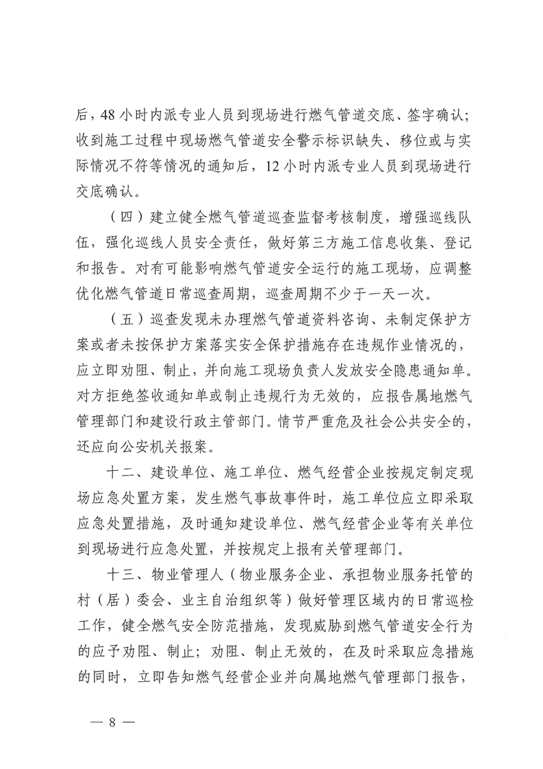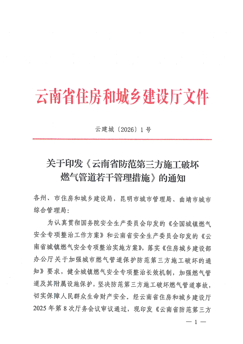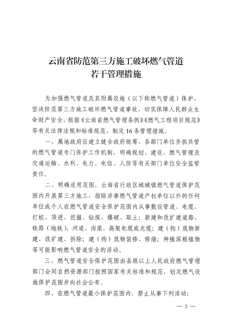 关于印发《云南省防范第三方施工破坏燃气管道若干管理措施》的通知