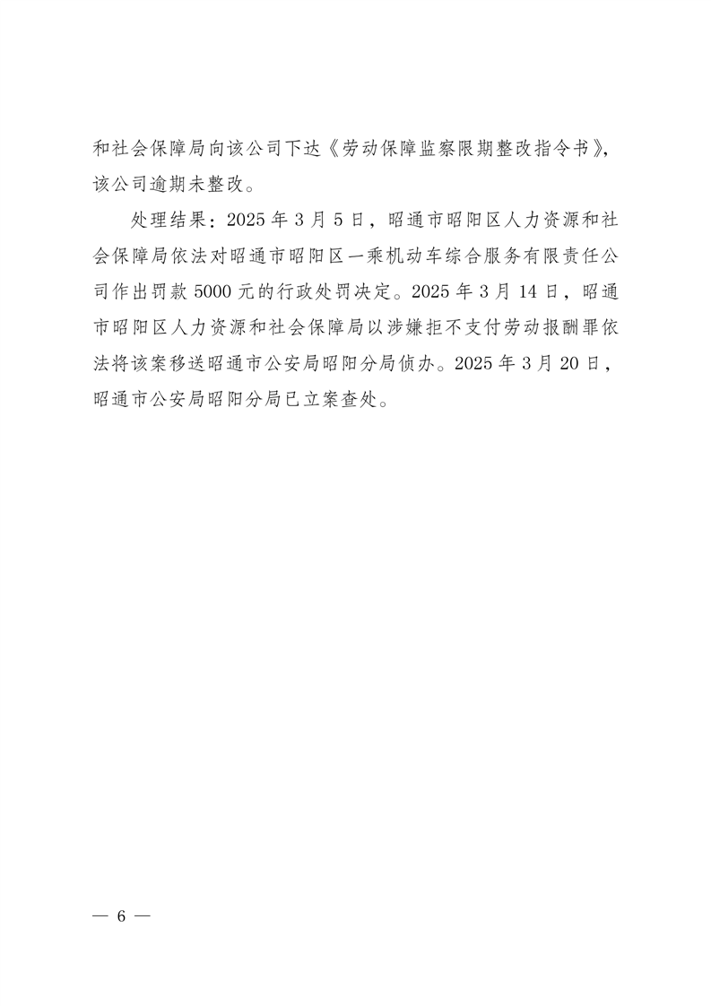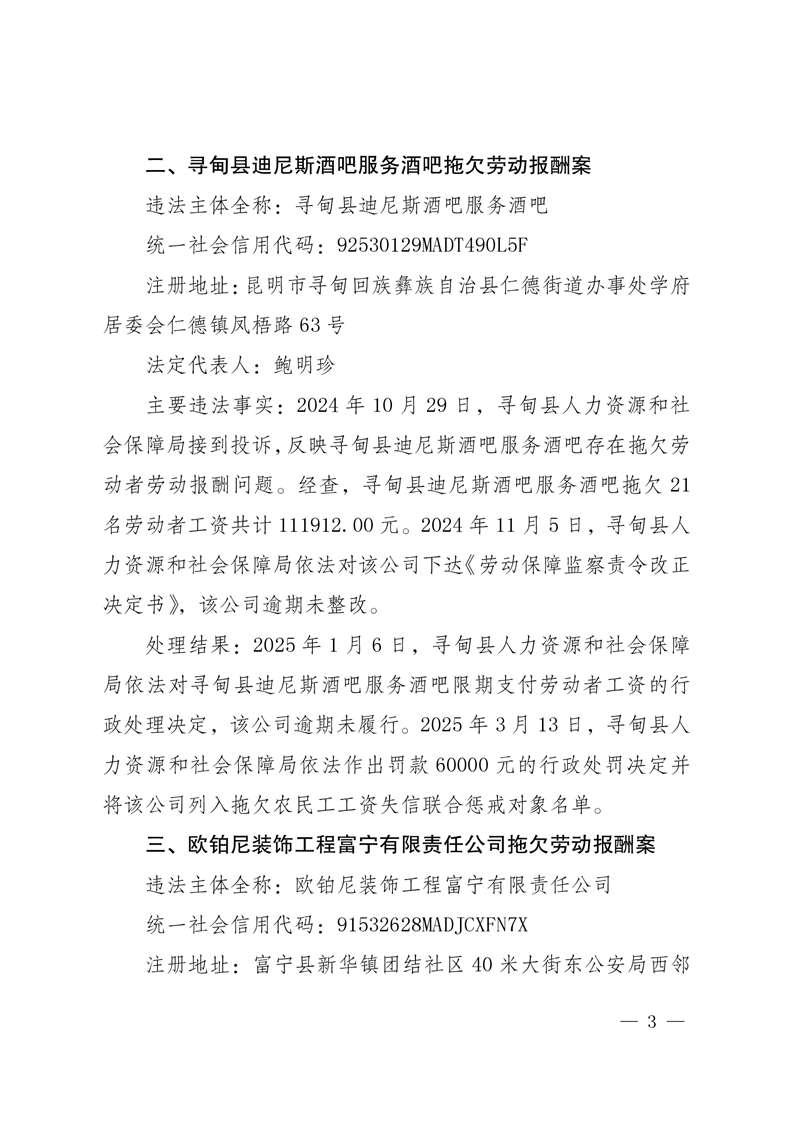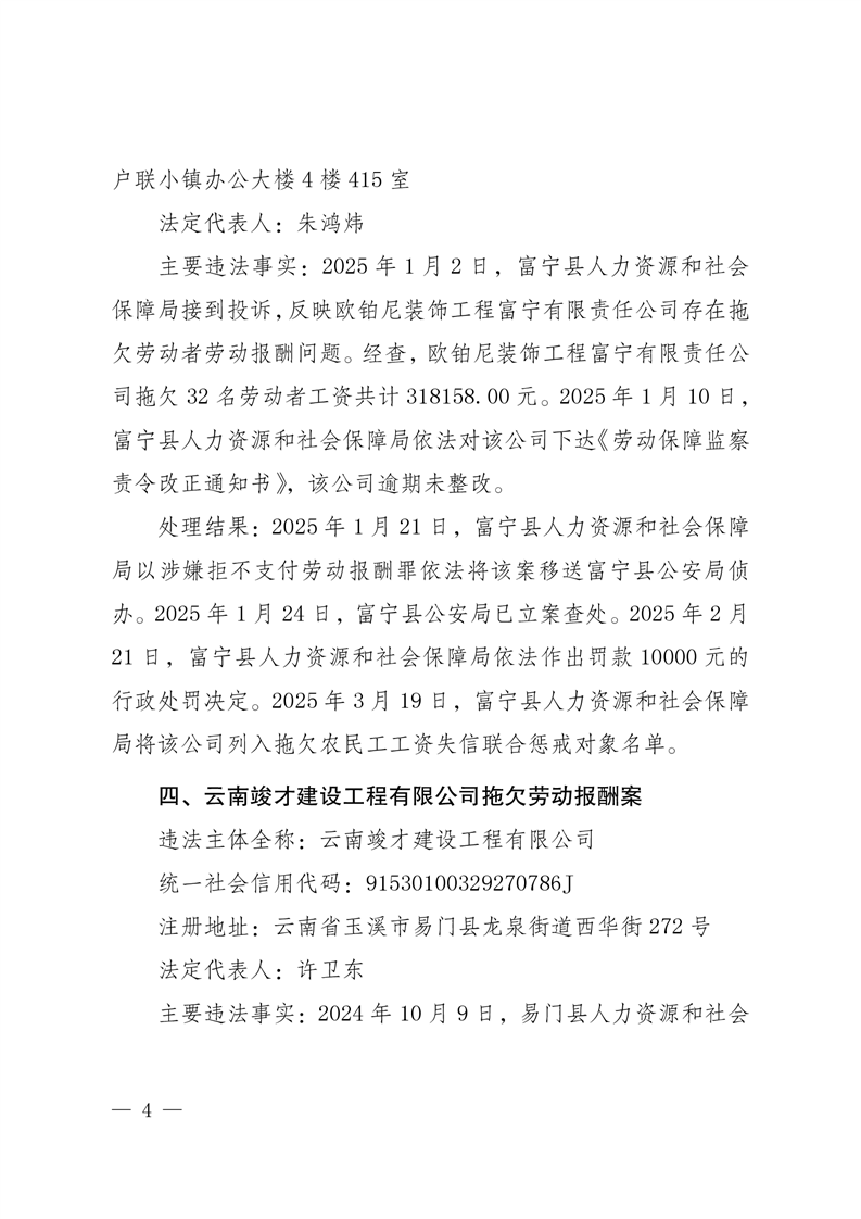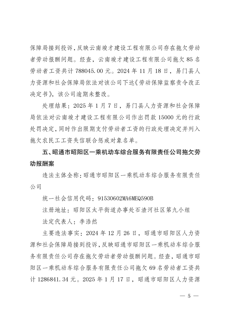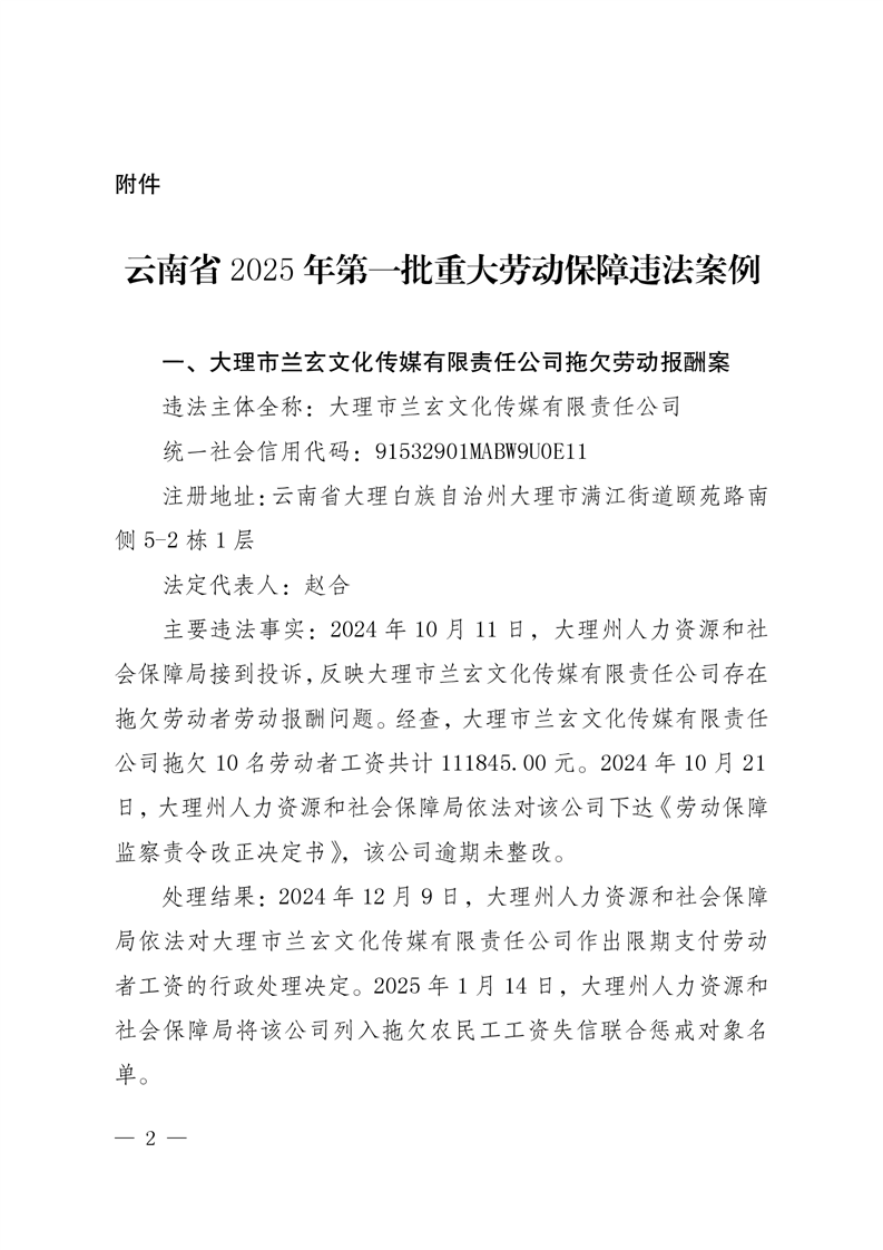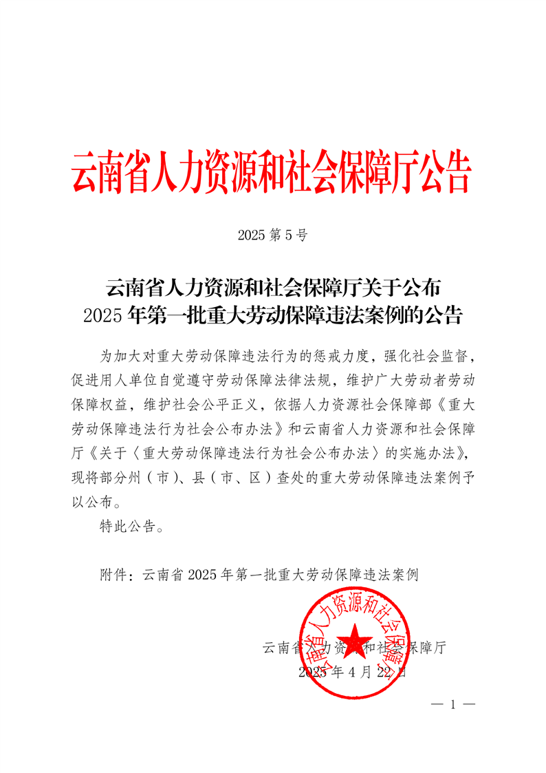 云南省人力资源和社会保障厅关于公布2025年第一批重大劳动保障违法案例的公告