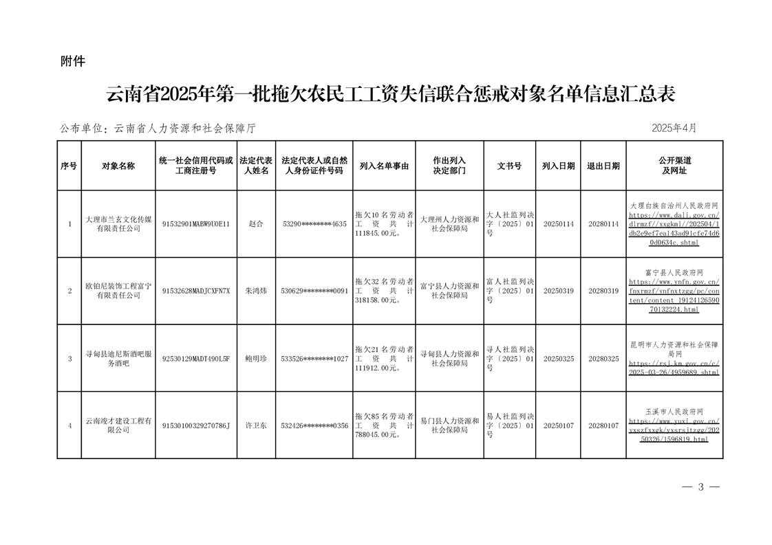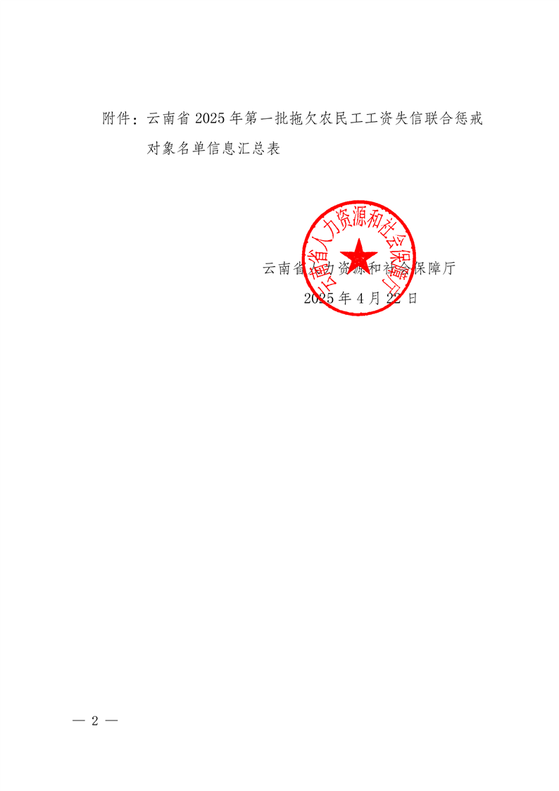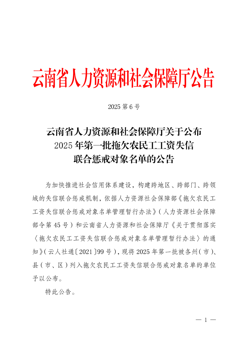 云南省人力资源和社会保障厅关于公布2025年第一批拖欠农民工工资失信联合惩戒对象名单的公告