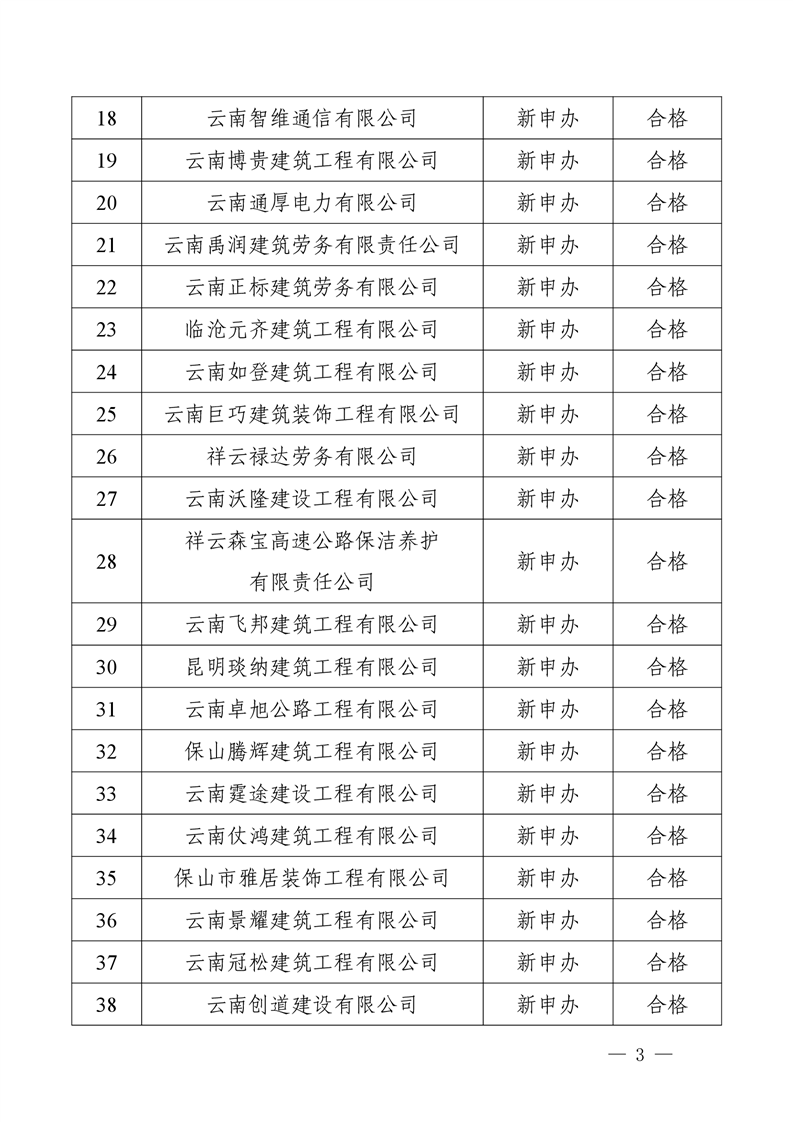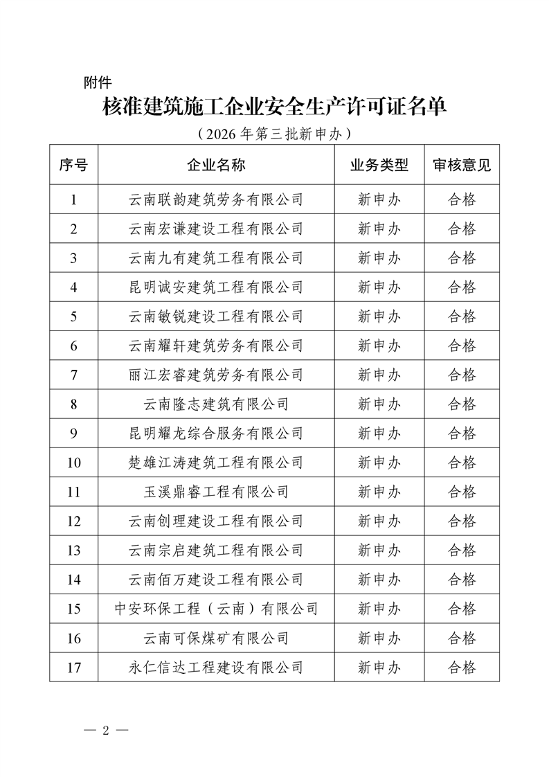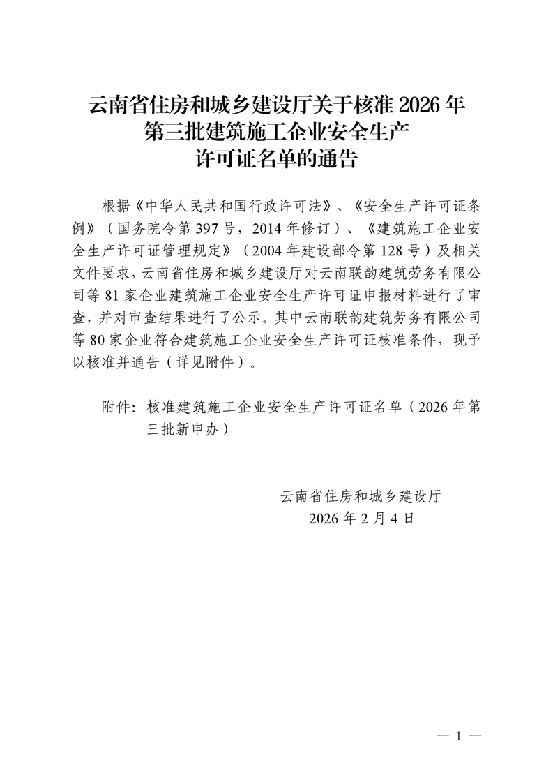 云南省住房和城乡建设厅关于核准2026年第三批建筑施工企业安全生产许可证名单的通告