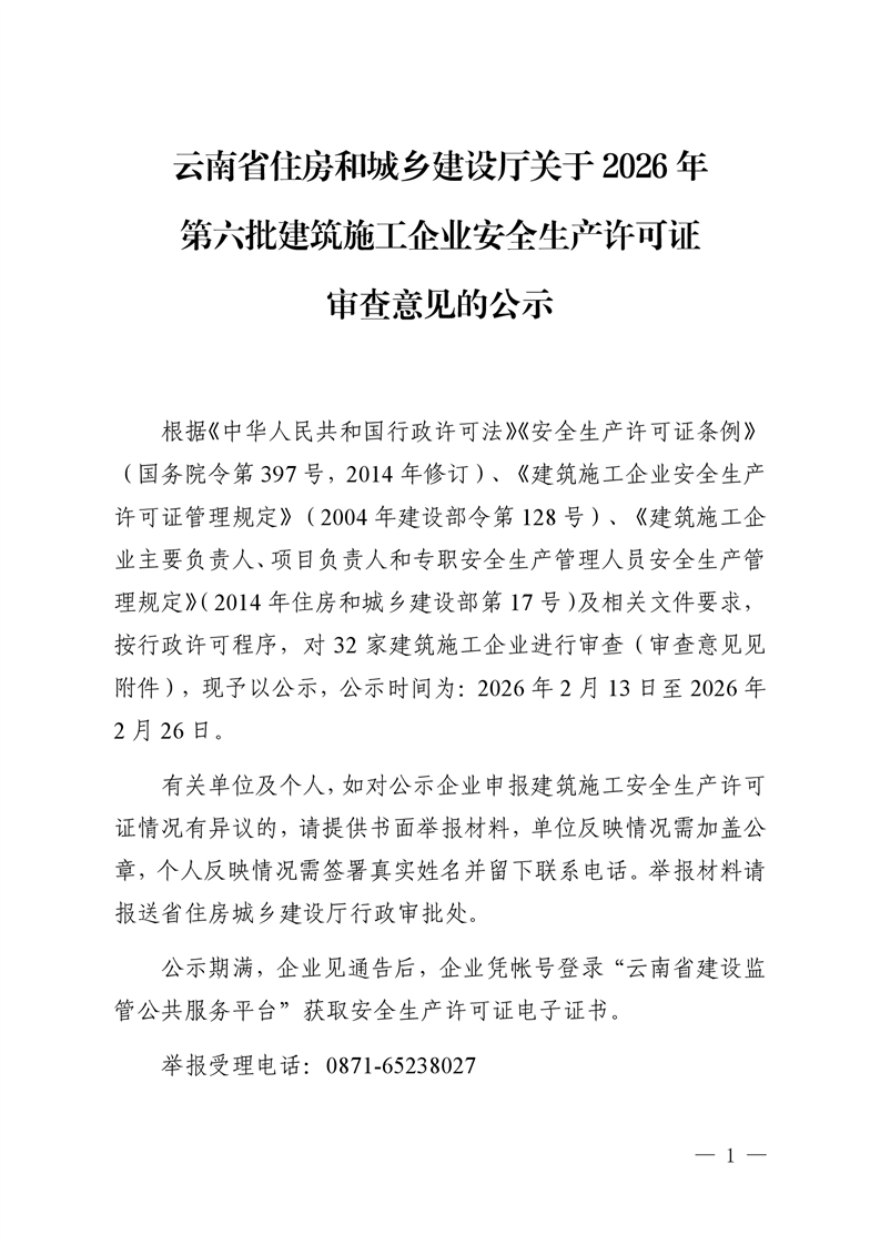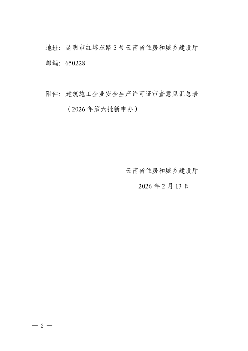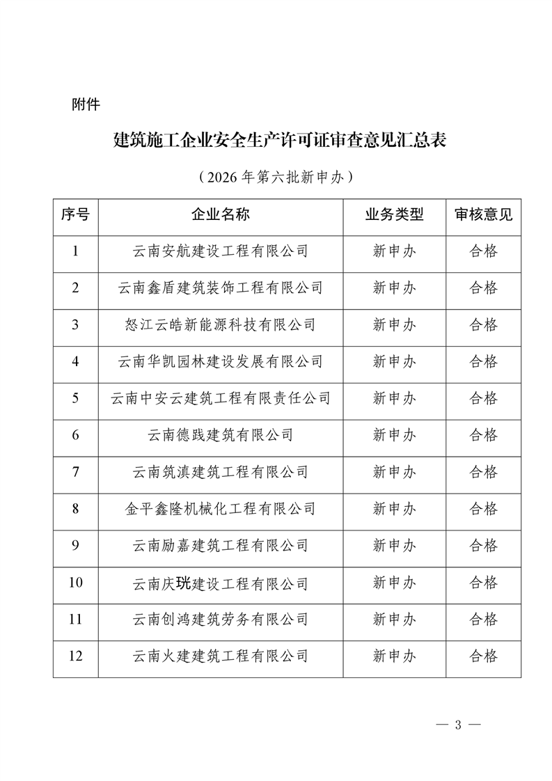 云南省住房和城乡建设厅关于2026年第六批建筑施工企业安全生产许可证审查意见的公示