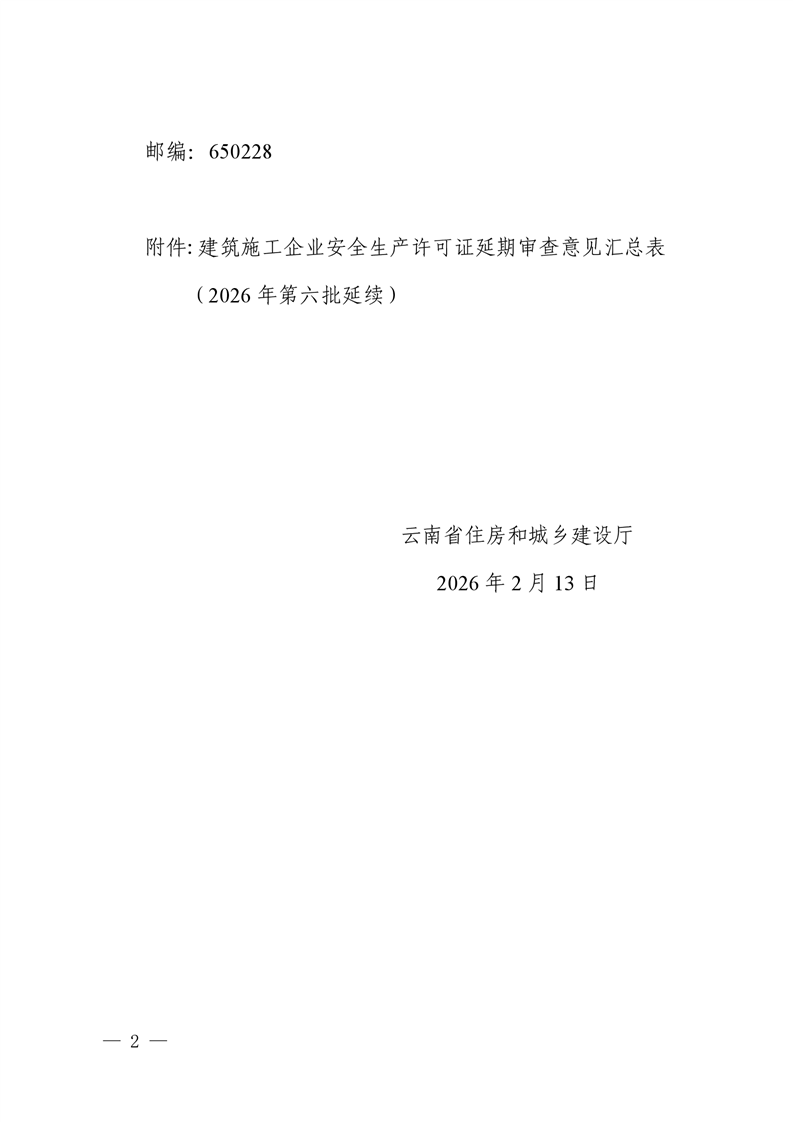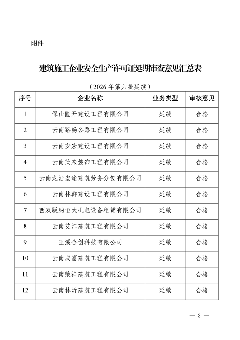云南省住房和城乡建设厅关于2026年第六批建筑施工企业安全生产许可证有效期延期审查意见的公示