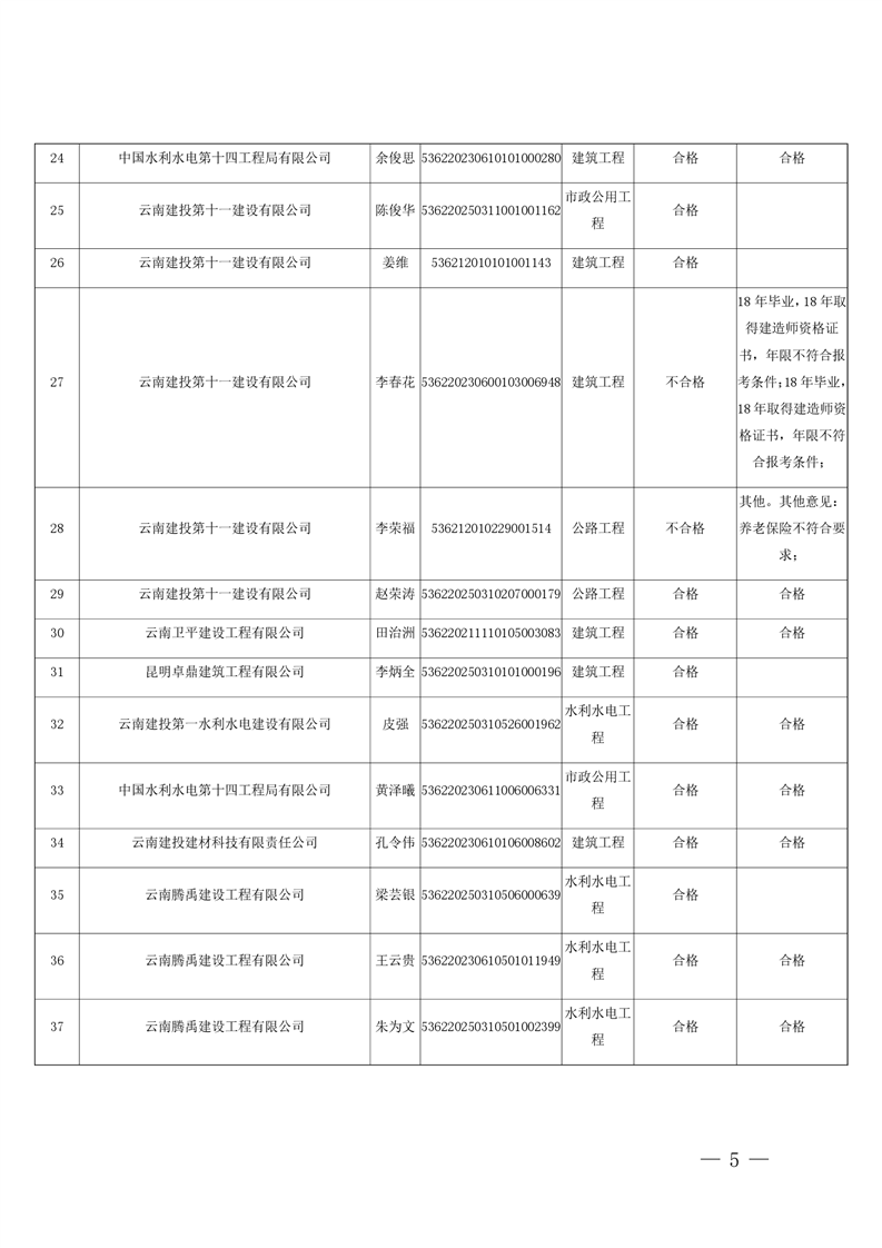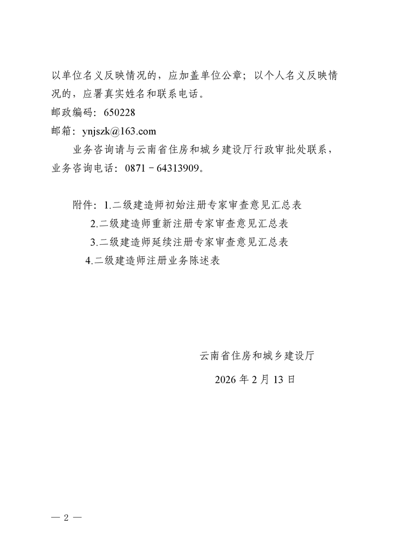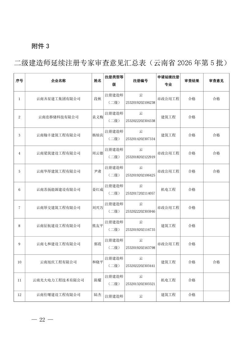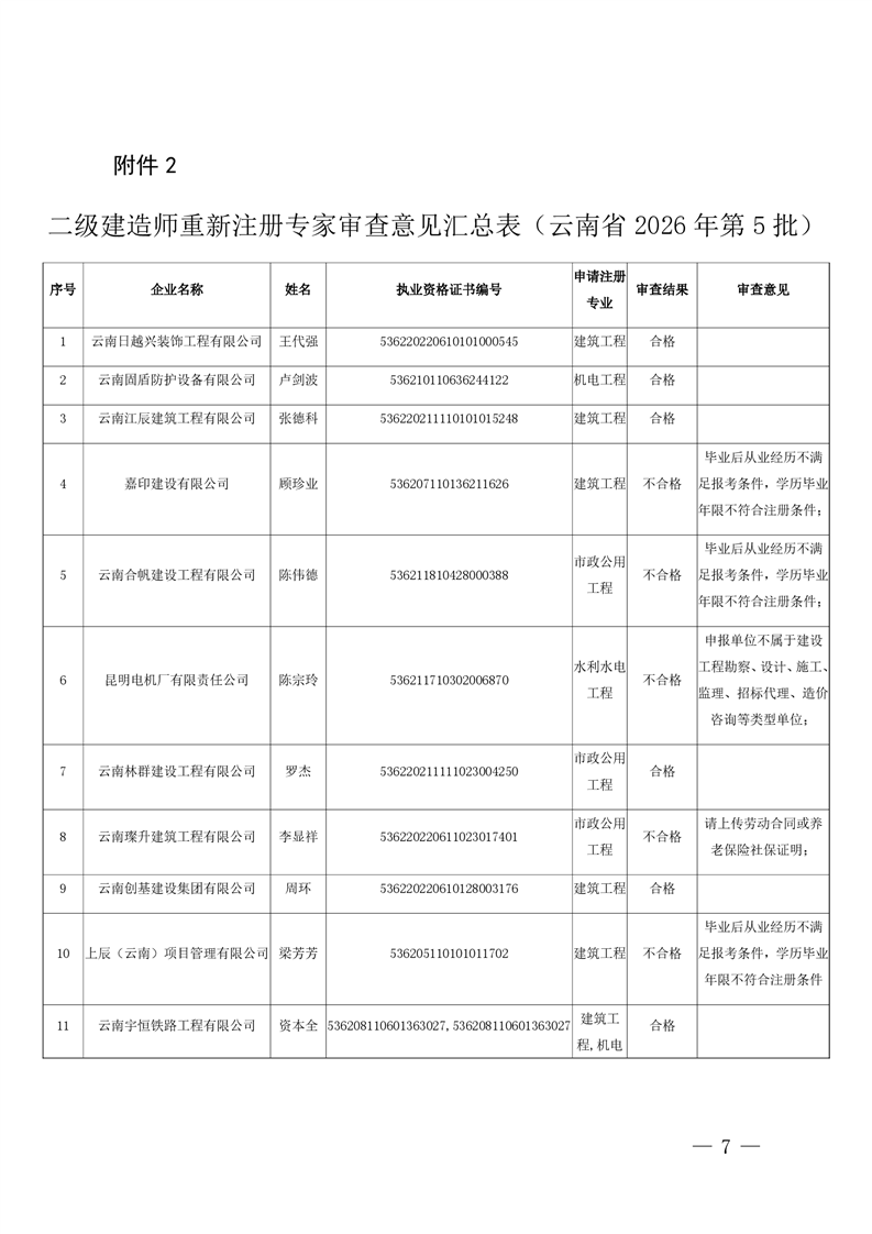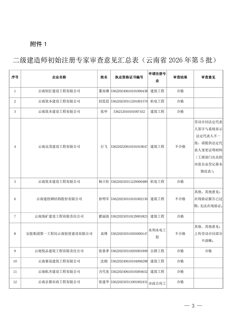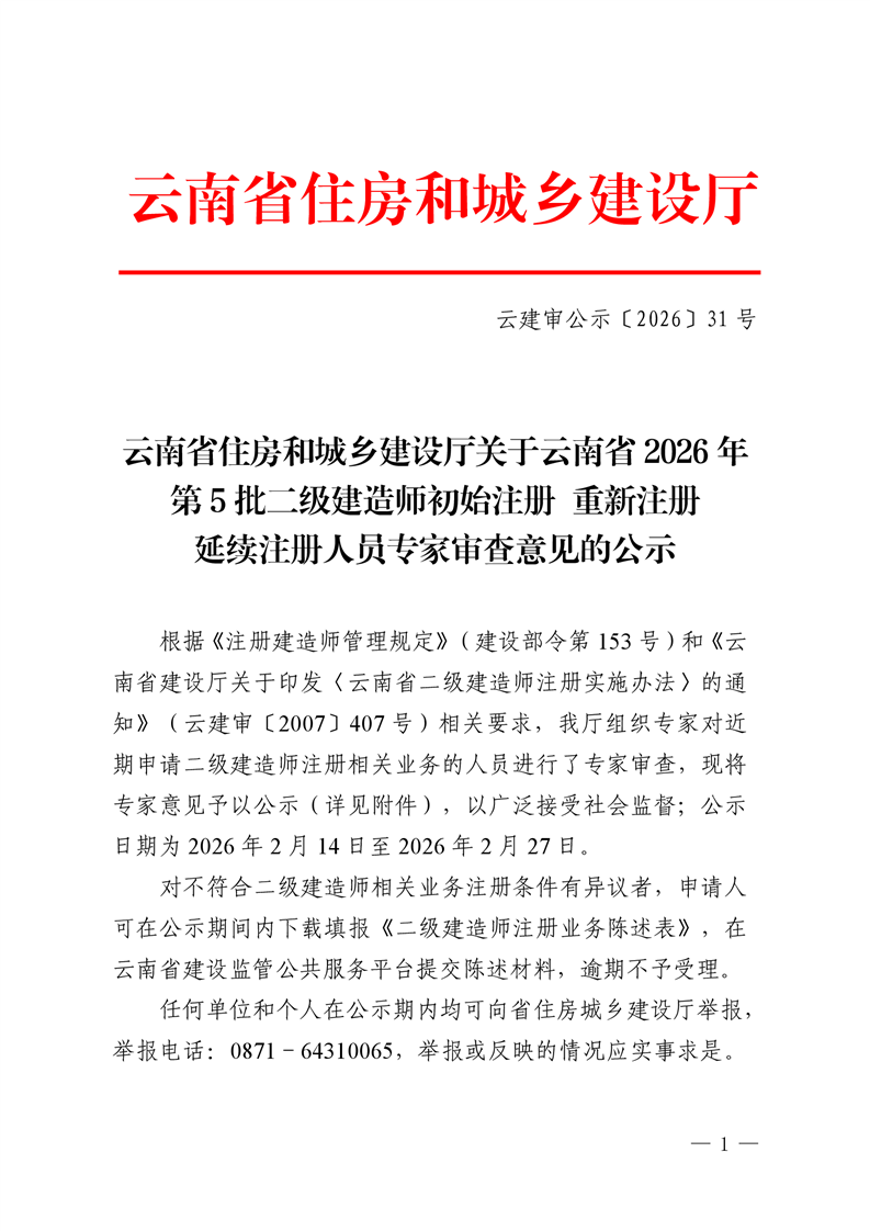 云南省住房和城乡建设厅关于云南省2026年第5批二级建造师初始注册重新注册延续注册人员专家审查意见的公示