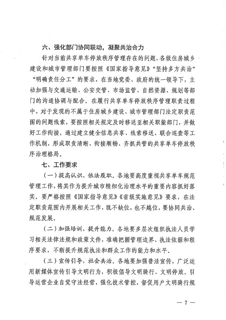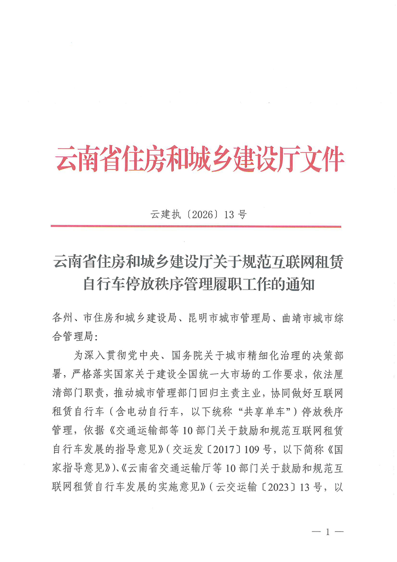 云南省住房和城乡建设厅关于规范互联网租赁自行车停放秩序管理履职工作的通知