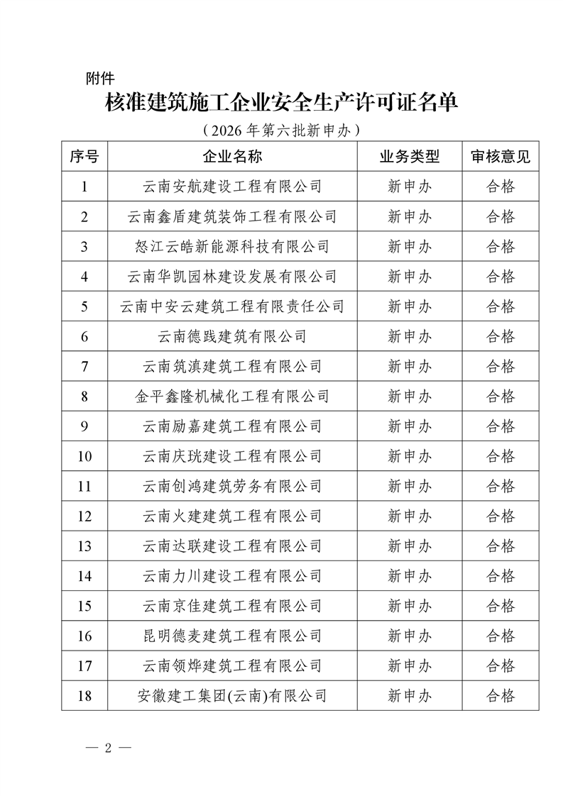 云南省住房和城乡建设厅关于核准2026年第六批建筑施工企业安全生产许可证名单的通告