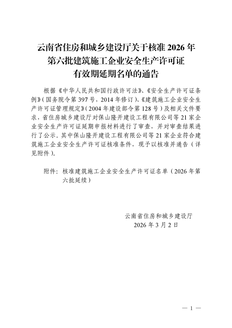 云南省住房和城乡建设厅关于核准2026年第六批建筑施工企业安全生产许可证有效期延期名单的通告