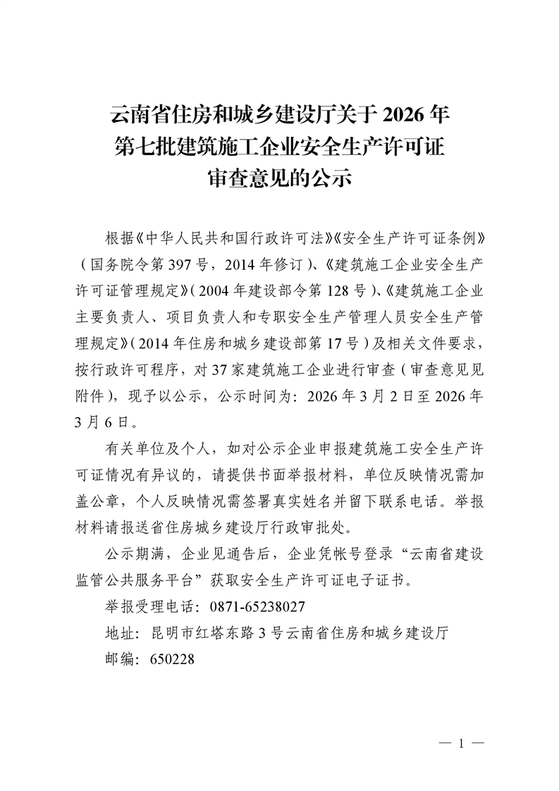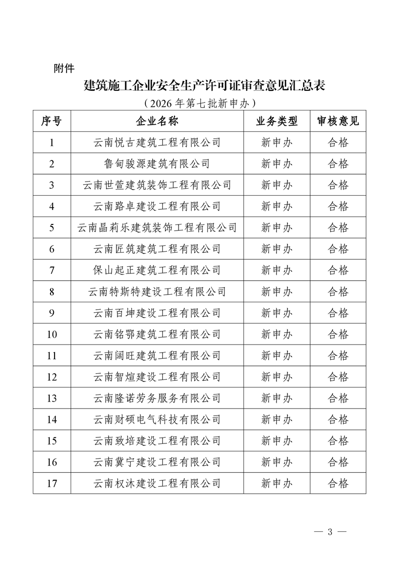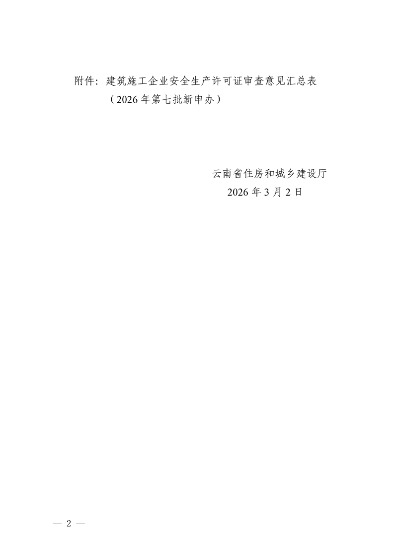 云南省住房和城乡建设厅关于2026年第七批建筑施工企业安全生产许可证审查意见的公示