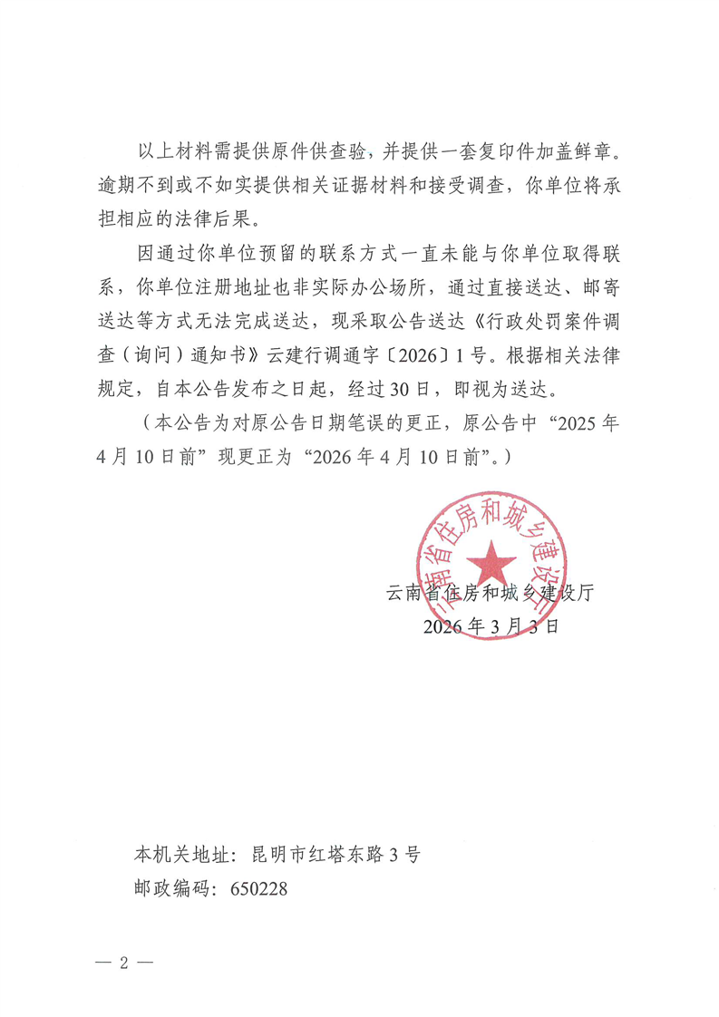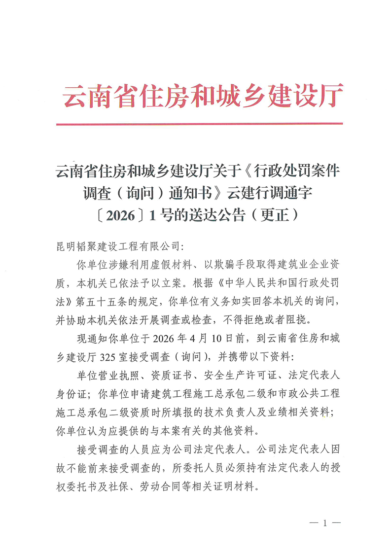 云南省住房和城乡建设厅关于《行政处罚案件调查(询问)通知书》云建行调通字〔2026〕1号的送达公告(更正)