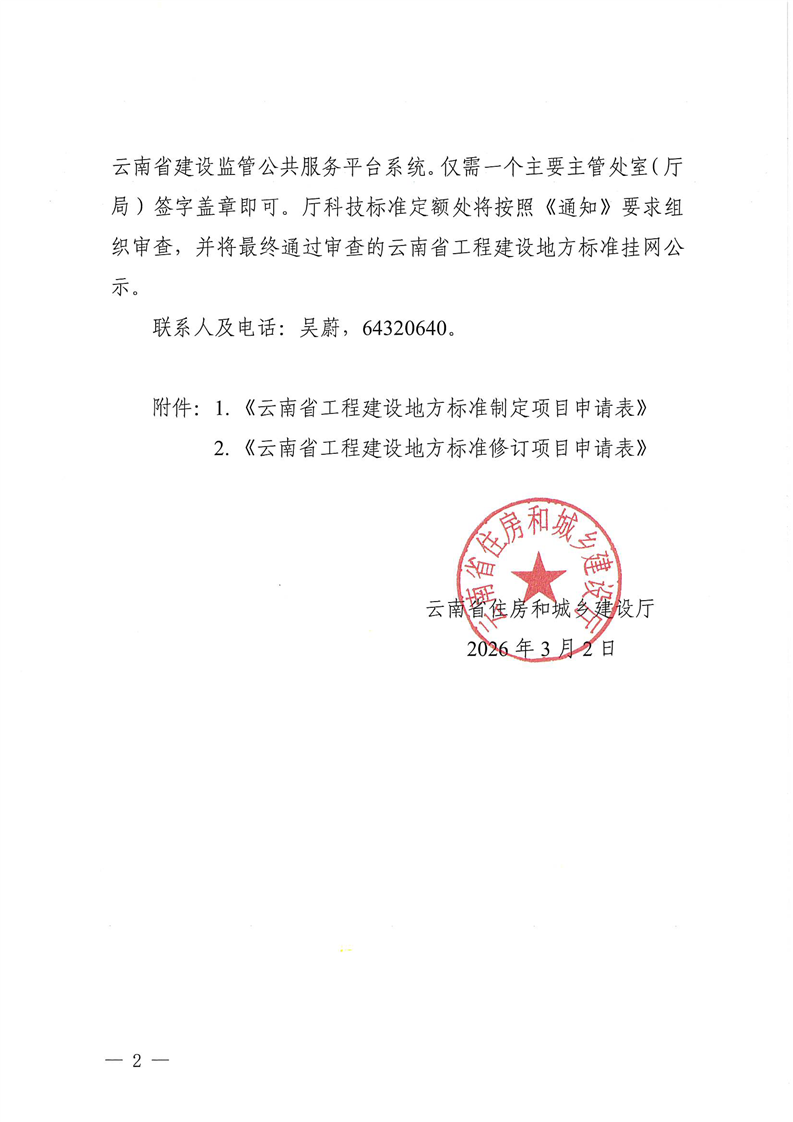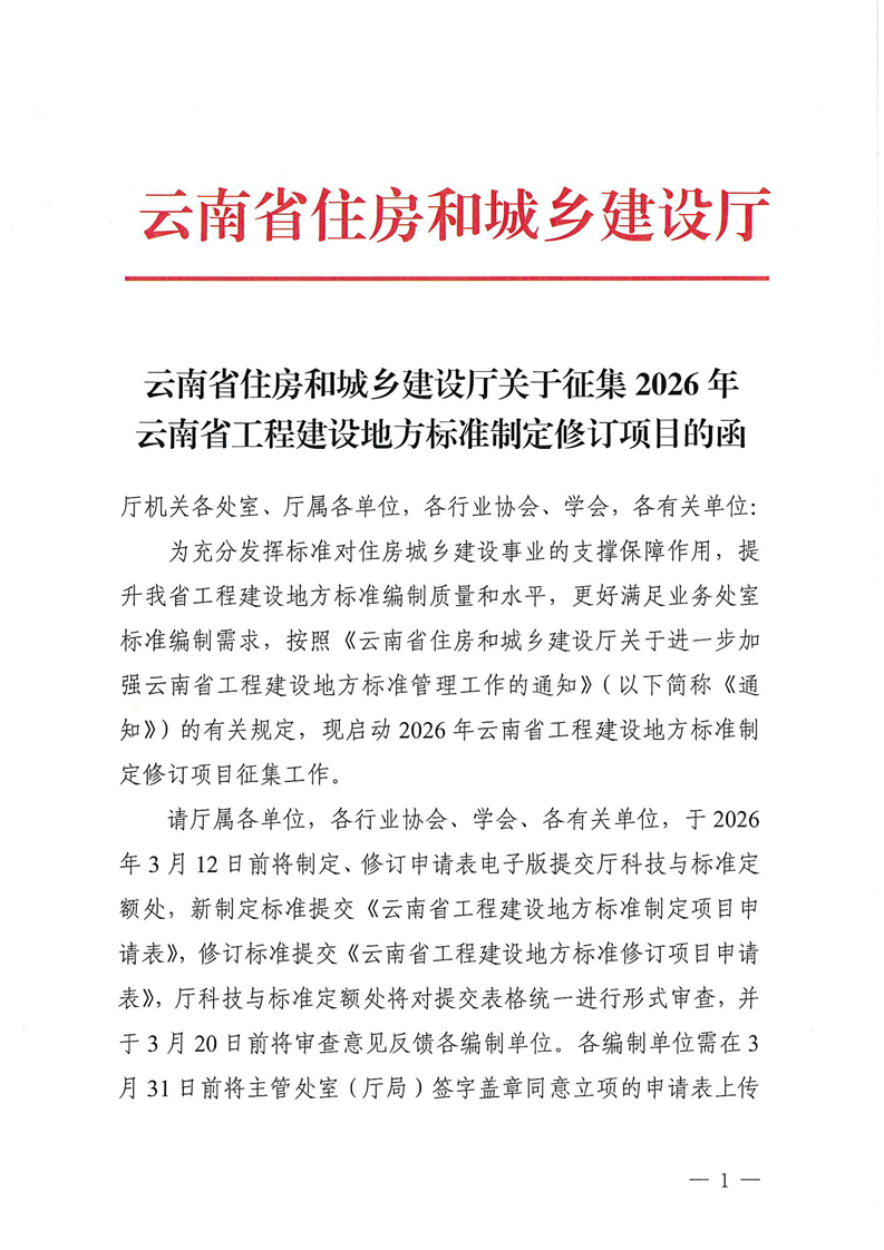 云南省住房和城乡建设厅关于征集2026年云南省工程建设地方标准制定修订项目的函