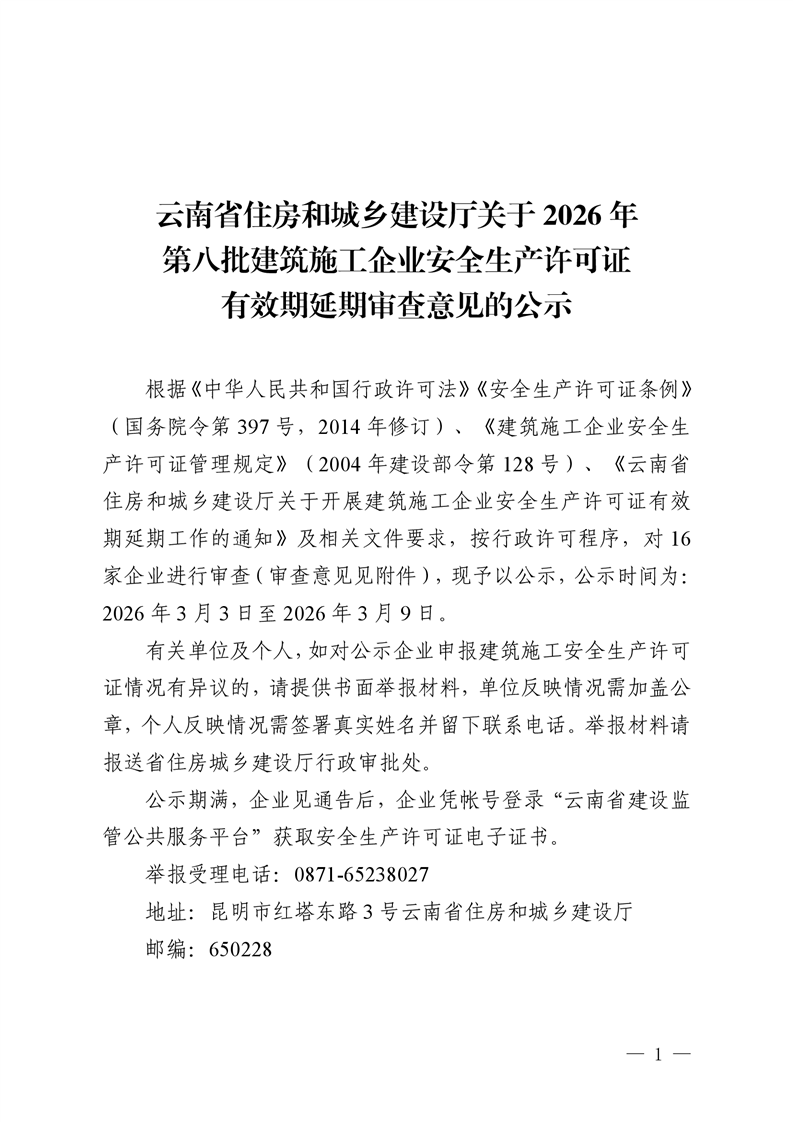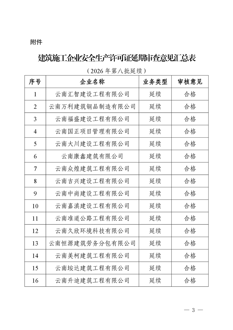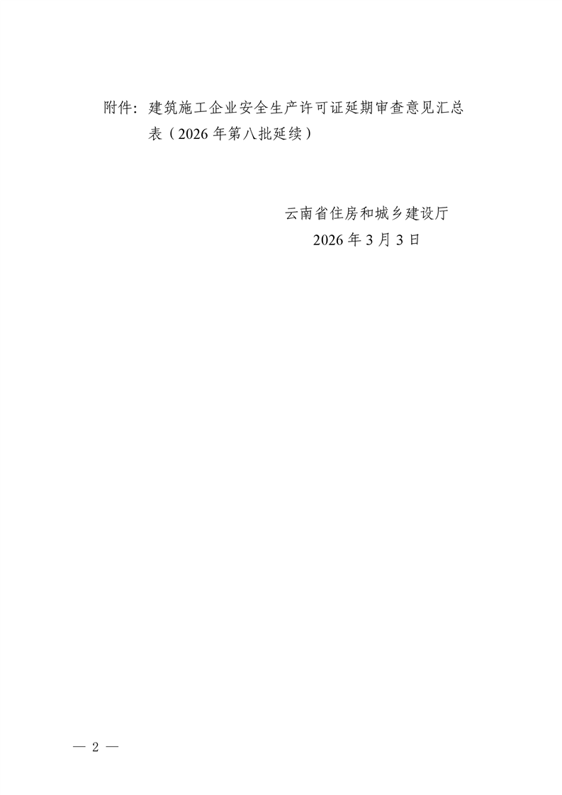云南省住房和城乡建设厅关于2026年第八批建筑施工企业安全生产许可证有效期延期审查意见的公示