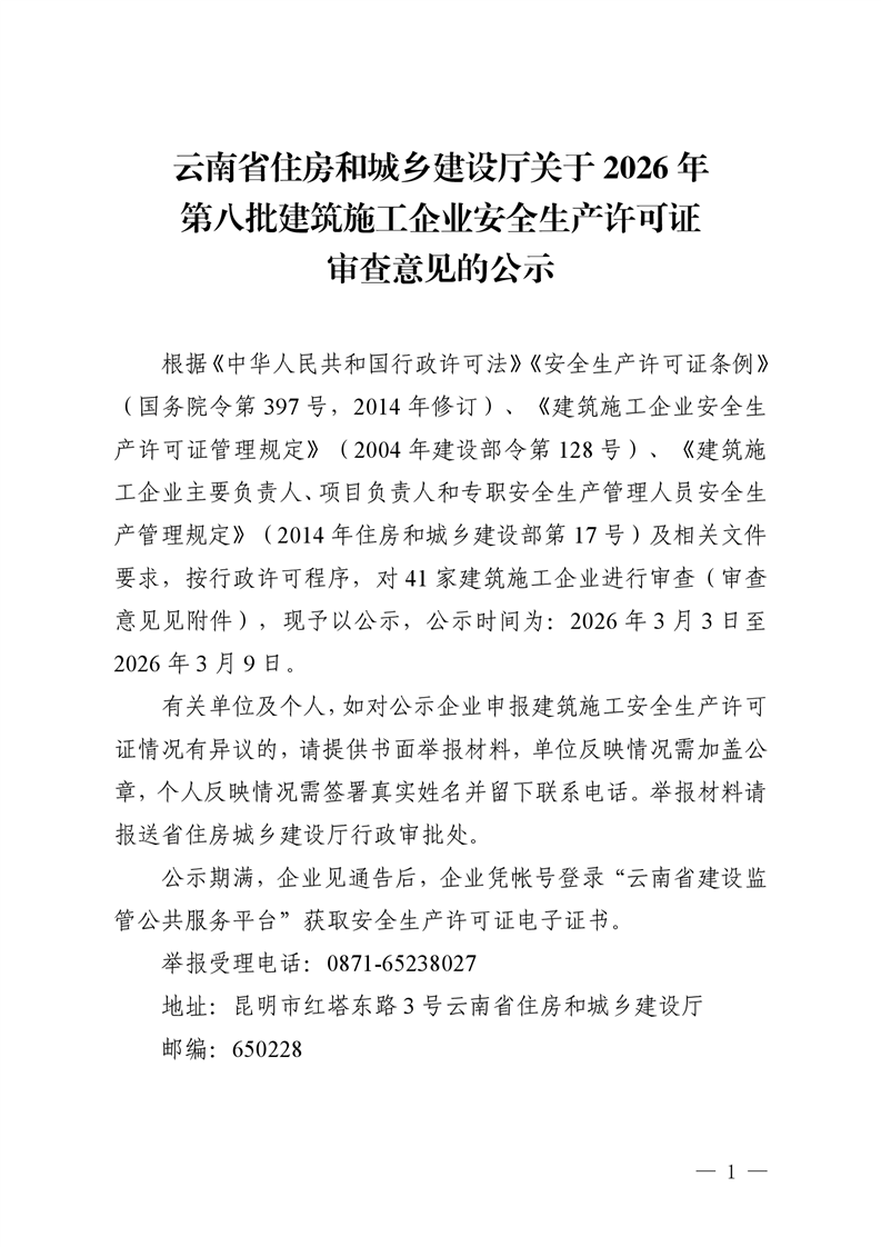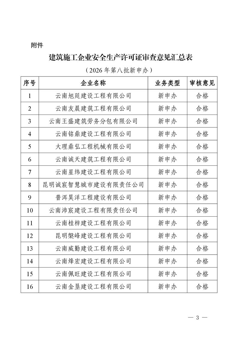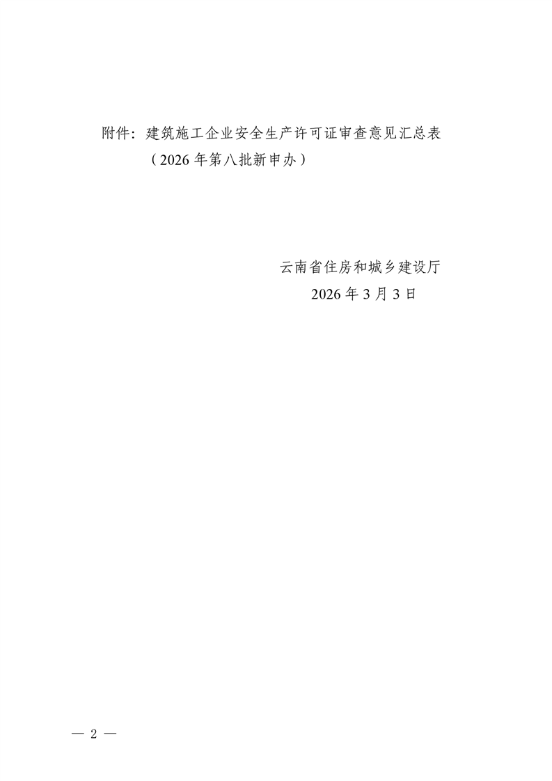 云南省住房和城乡建设厅关于2026年第八批建筑施工企业安全生产许可证审查意见的公示