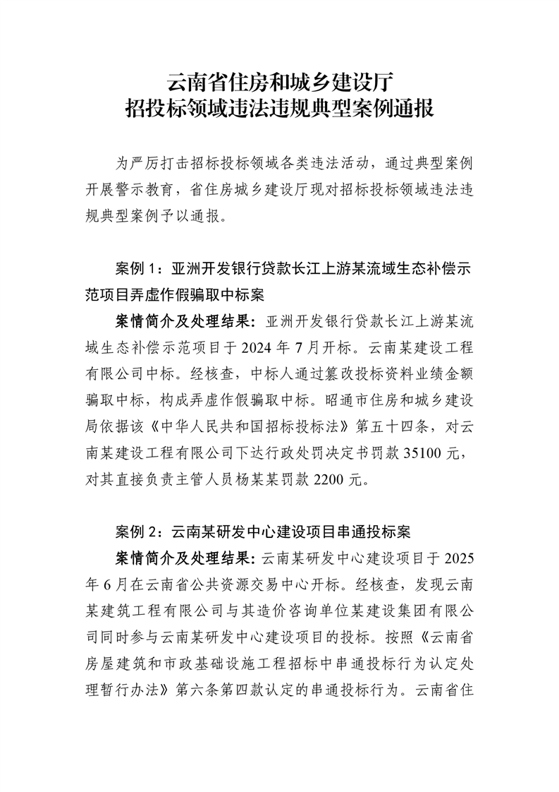 云南省住房和城乡建设厅招投标领域违法违规典型案例通报