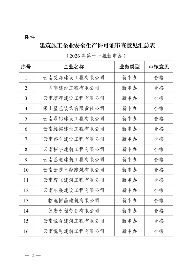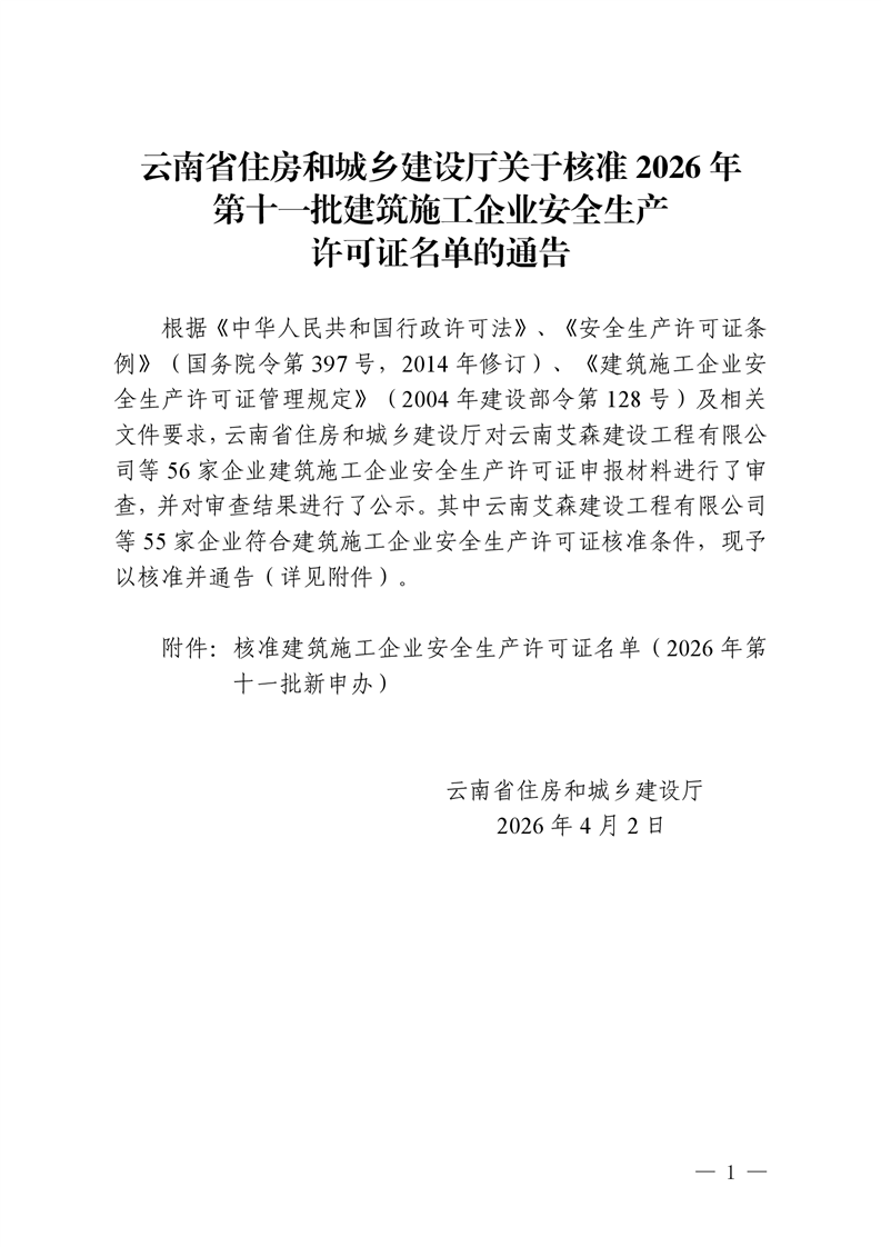 云南省住房和城乡建设厅关于核准2026年第十一批建筑施工企业安全生产许可证名单的通告