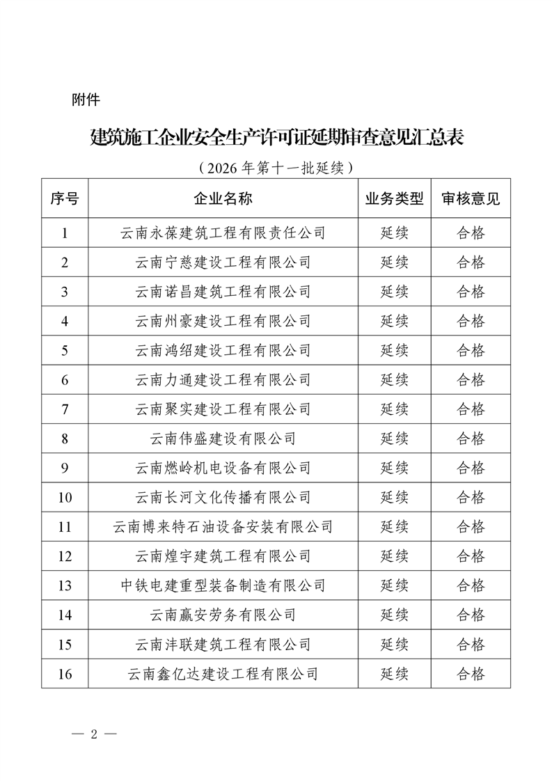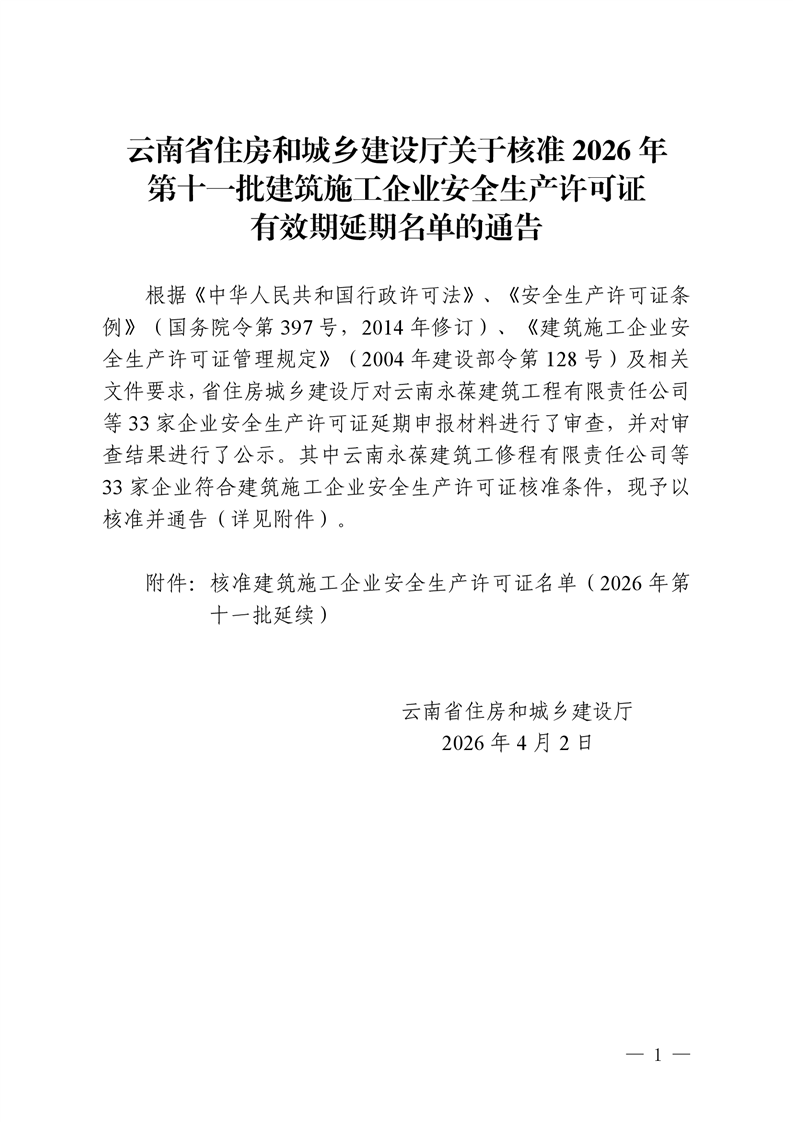 云南省住房和城乡建设厅关于核准2026年第十一批建筑施工企业安全生产许可证有效期延期名单的通告