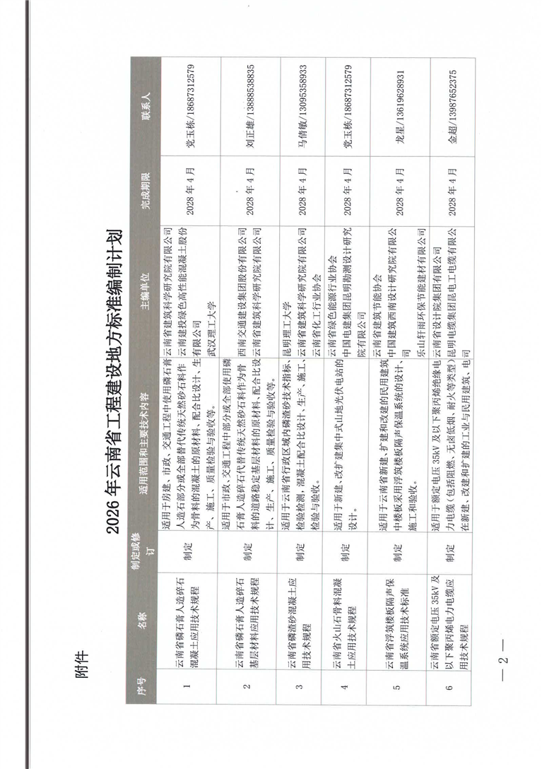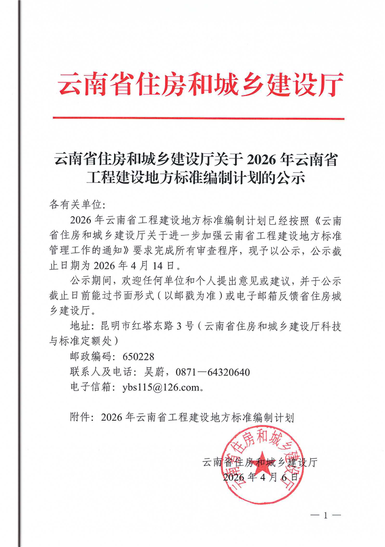 云南省住房和城乡建设厅关于2026年云南省工程建设地方标准编制计划的公示