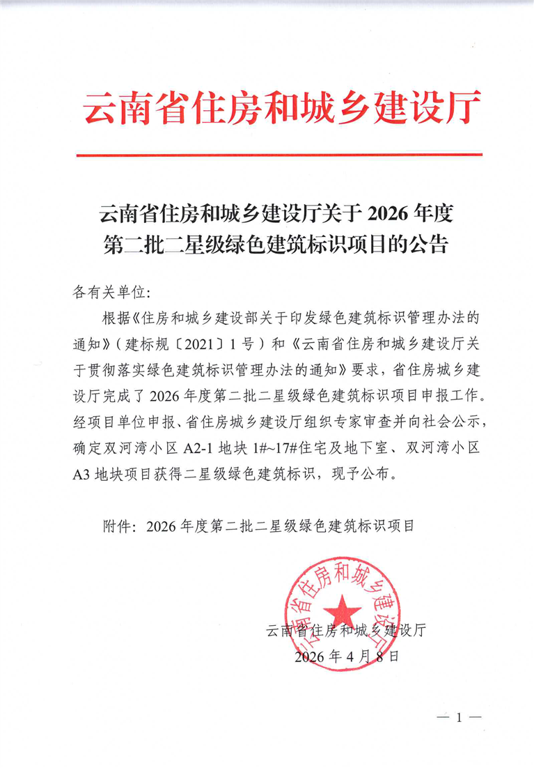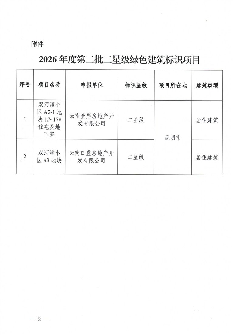 云南省住房和城乡建设厅关于2026年度第二批二星级绿色建筑标识项目的公告