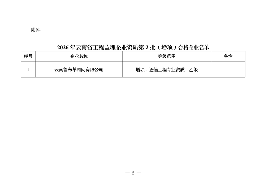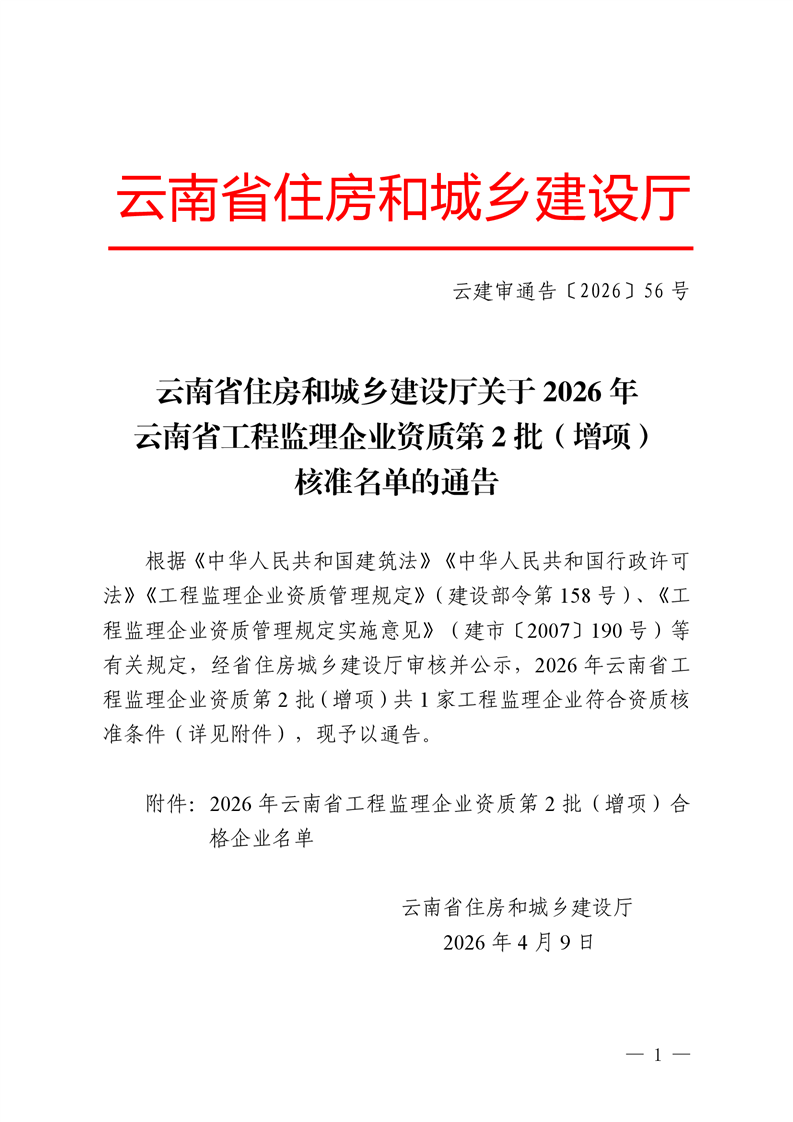 云南省住房和城乡建设厅关于2026年云南省工程监理企业资质第2批(增项)核准名单的通告