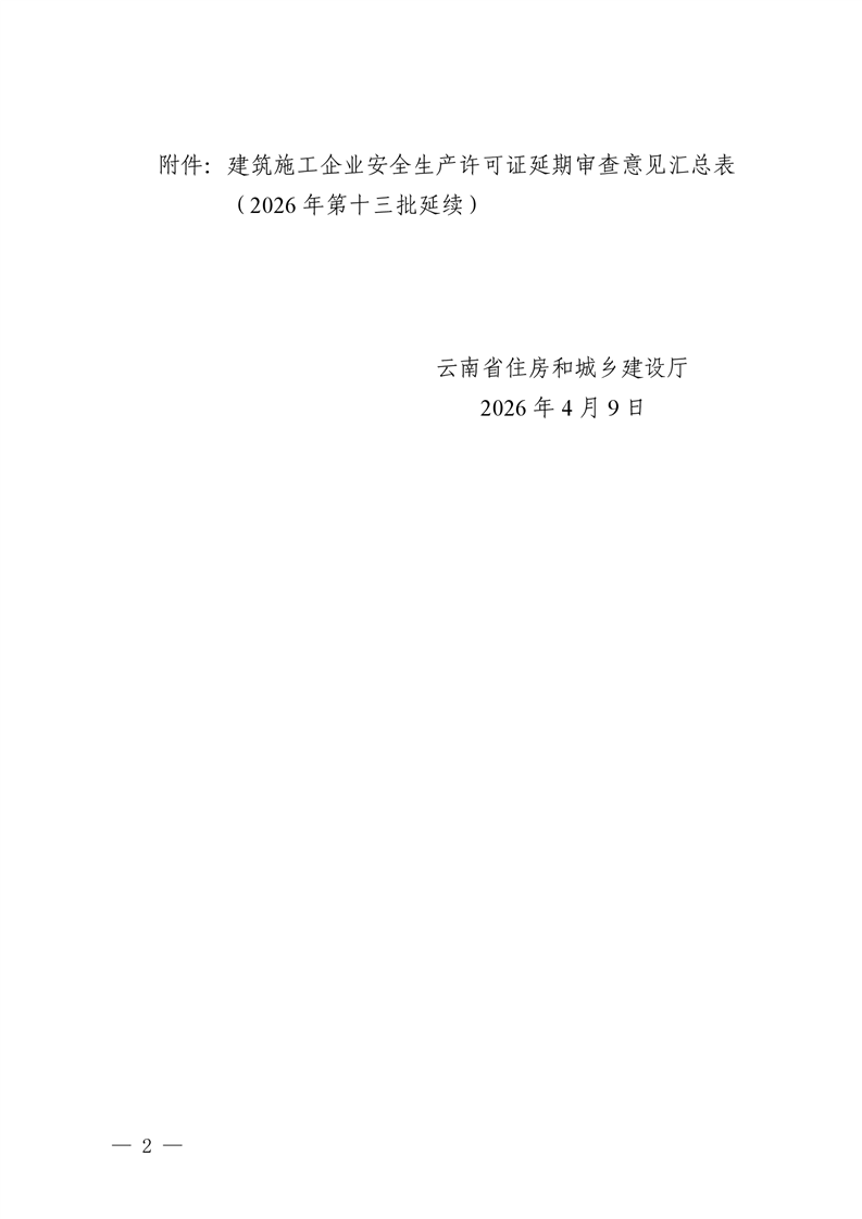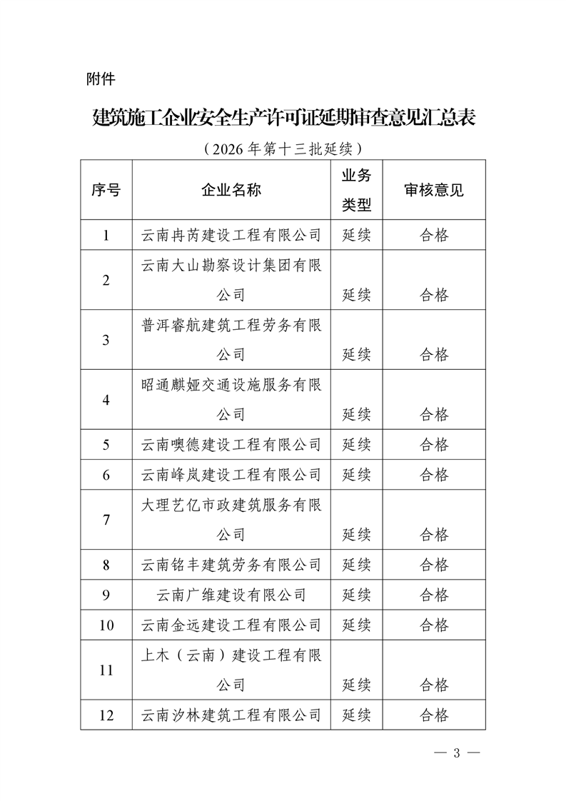 云南省住房和城乡建设厅关于2026年第十三批建筑施工企业安全生产许可证有效期延期审查意见的公示