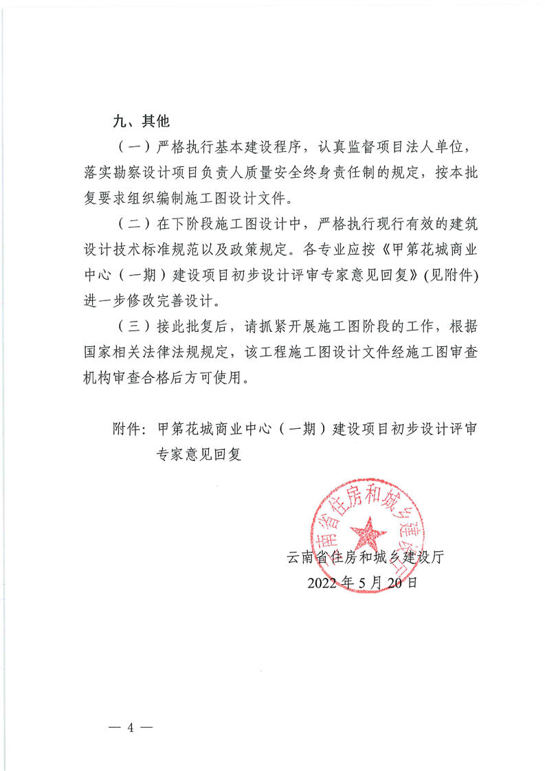 云南省住房和城乡建设厅关于甲第花城商业中心(一期)建设项目初步设计的批复