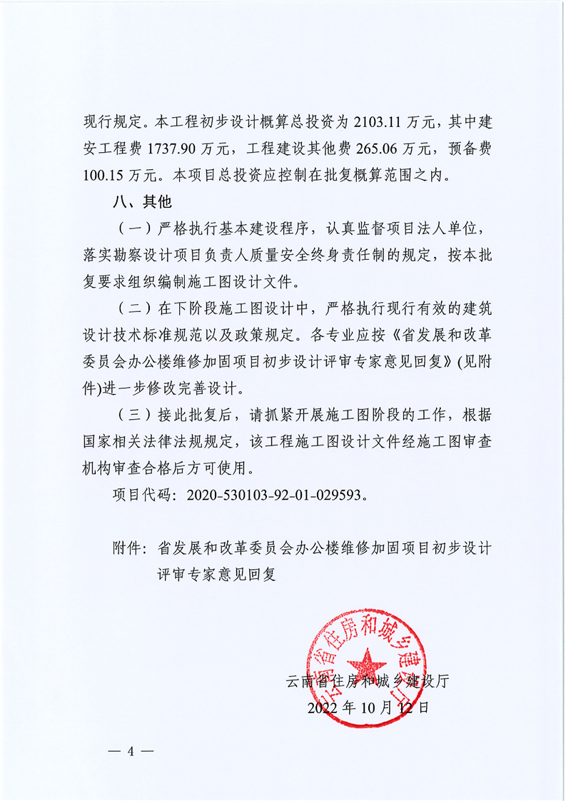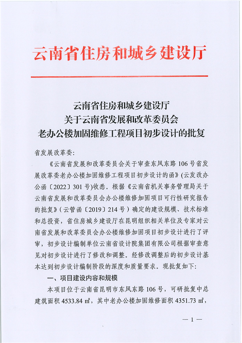 云南省住房和城乡建设厅关于云南省发展和改革委员会老办公楼加固维修工程项目初步设计的批复