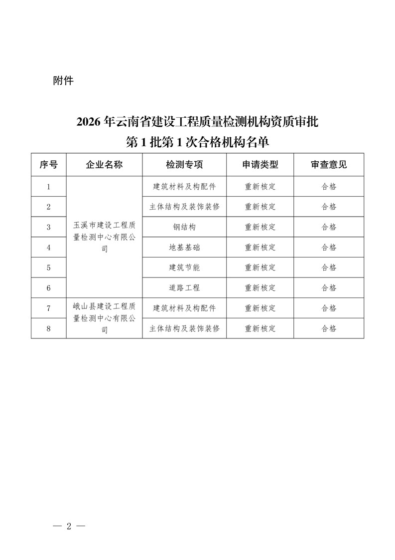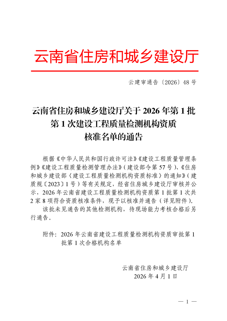 云南省住房和城乡建设厅关于2026年第1批第1次建设工程质量检测机构资质核准名单的通告