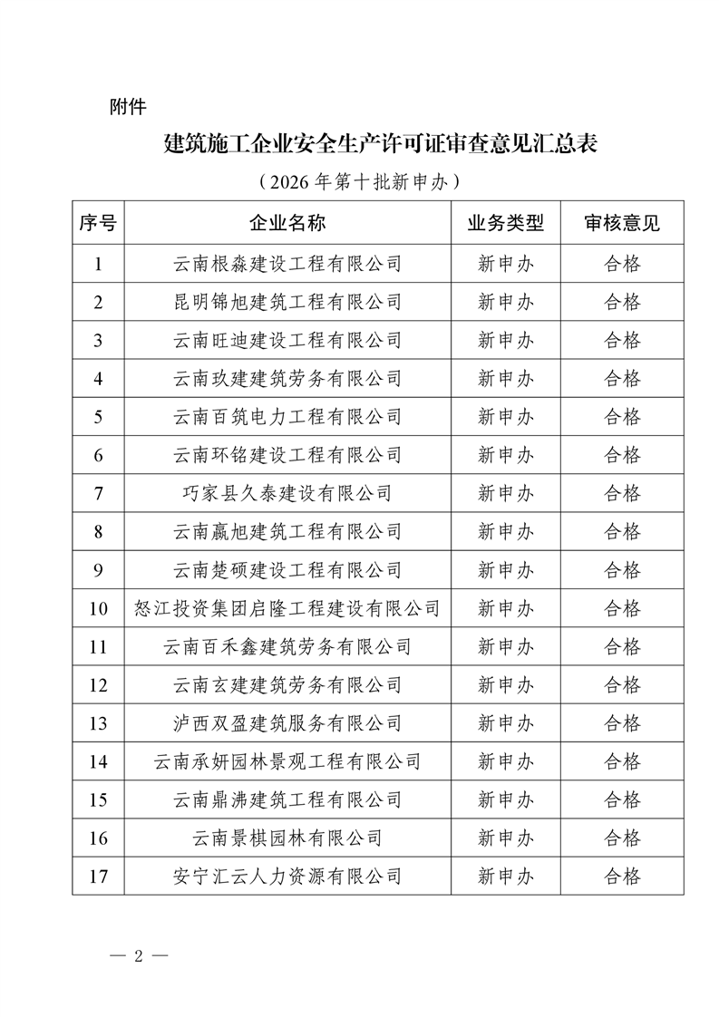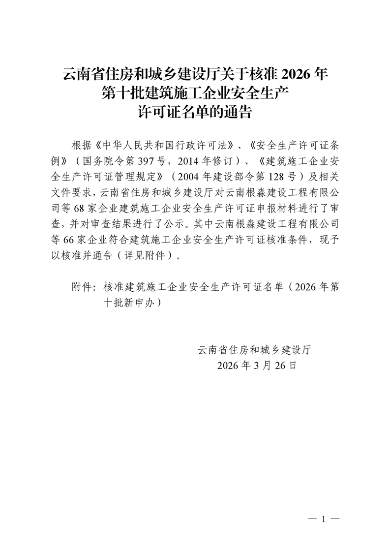 云南省住房和城乡建设厅关于核准2026年第十批建筑施工企业安全生产许可证名单的通告