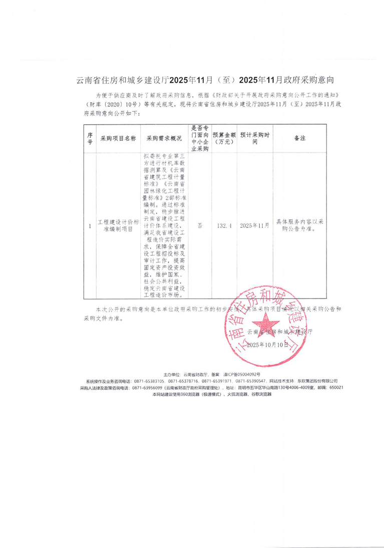 云南省住房和城乡建设厅2025年11月(至)2025年11月政府采购意向